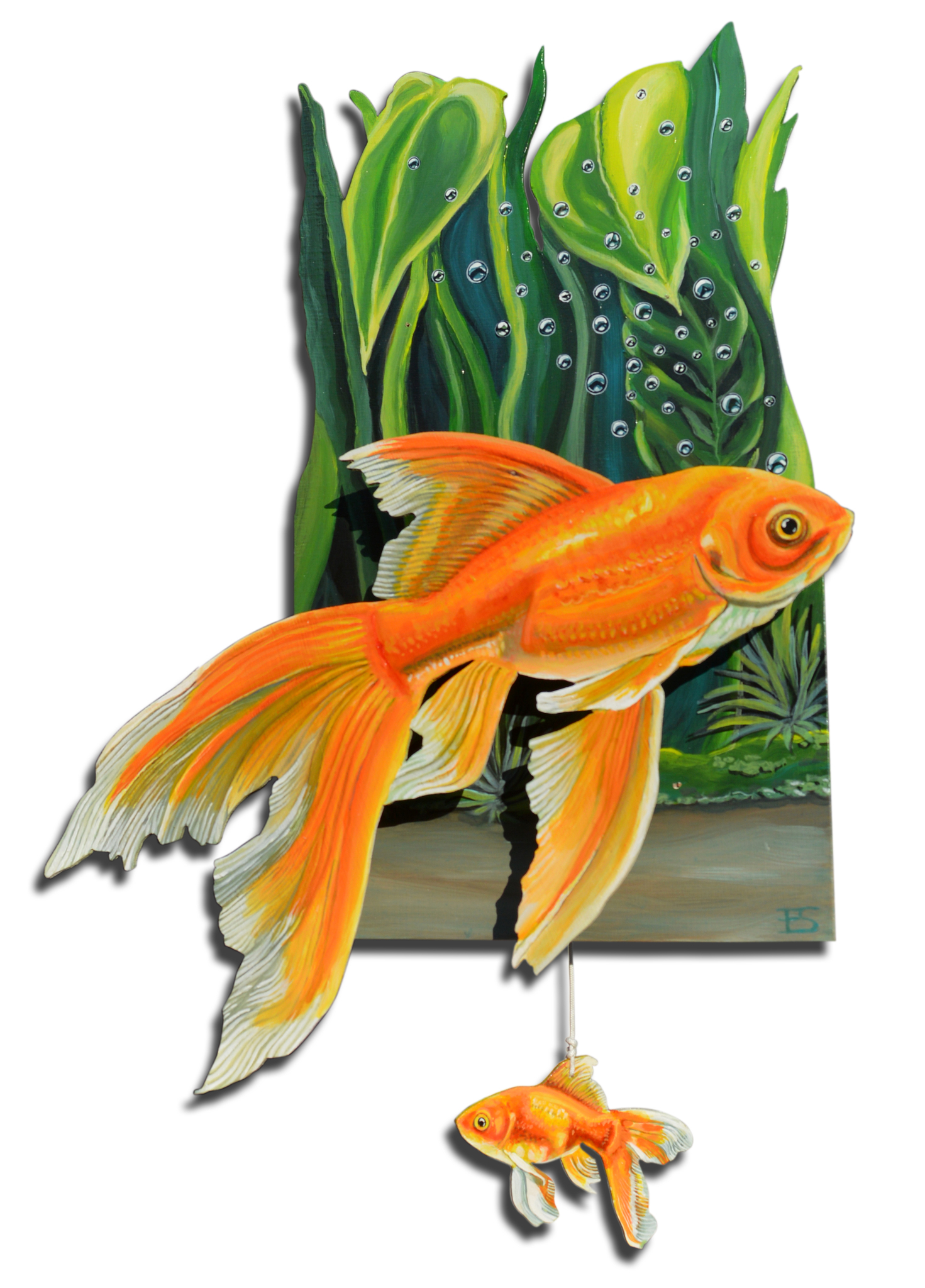 Sluiervisjes maken een hele hoop bubbels. Gezaagd uit triplex en beschilderd met acrylverf en 2 x gevernisd. Het kleine visje is verbonden met een touwtje aan het muziekdoosje dat 'Somewhere over the Rainbow' speelt en is er een klein lampje op de achterplaat bevestigd.