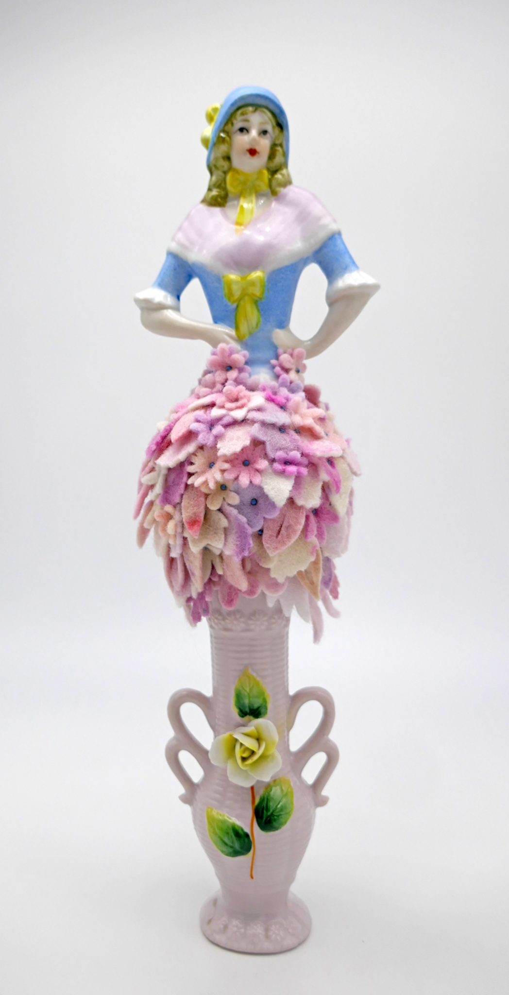 Deels handgeverfd wol vilt, antiek keramiek poppenhoofdje, kapot keramiek, glansgaren, foam, spelden.