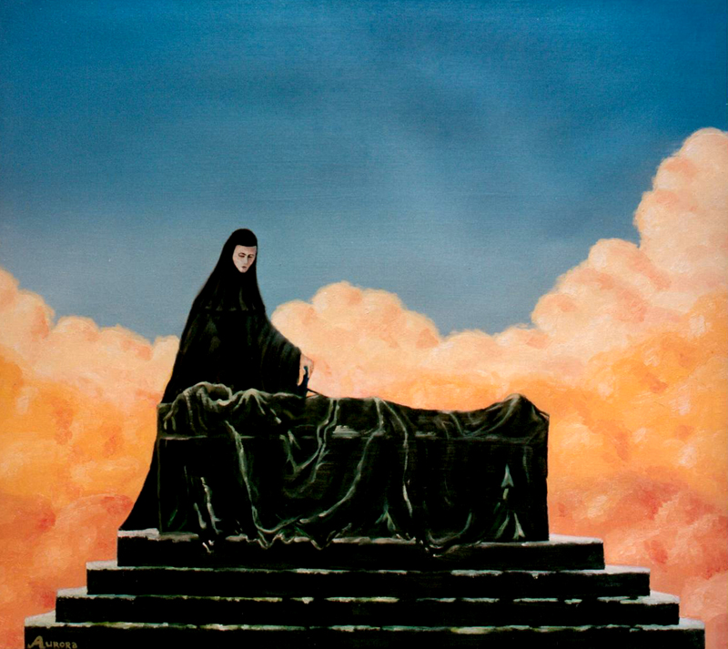 Schilderij Art Sunset Zonsondergang Oil Olieverf Kunst Painting Dood Rouw High Statue Death Treden Steps Grief Priestess Lijkkleed Priesterin