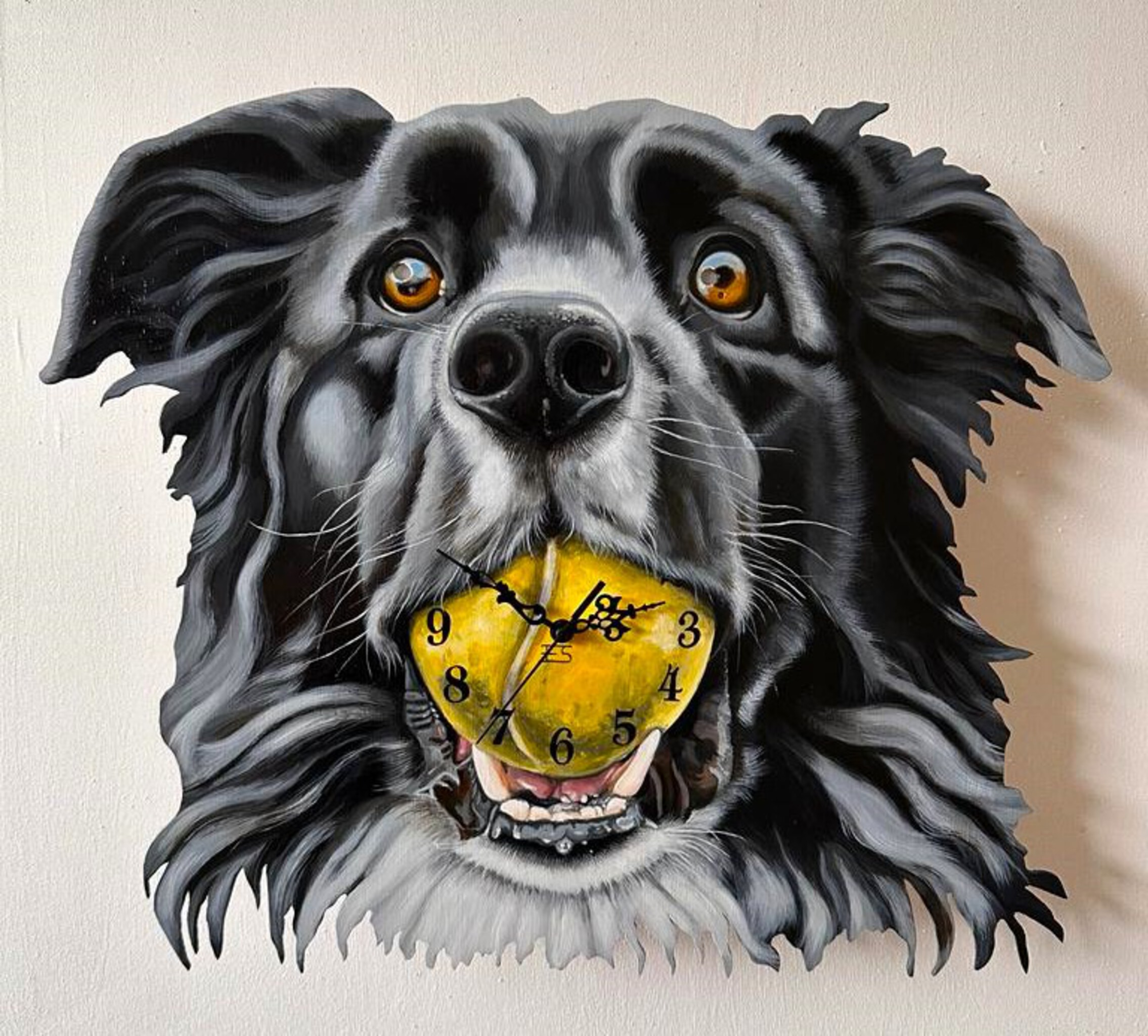 Tijd om je hond uit te laten! Deze kloklamp helpt je hond om hem niet te lang te laten wachten... Klok loopt op batterij en de lamp heeft een zwart snoer met schakelaar. Geschilderd op triplex van 3 mm. Wil je een kloklamp van je eigen huisdier laten maken? Ook dat behoort tot de mogelijkheden.