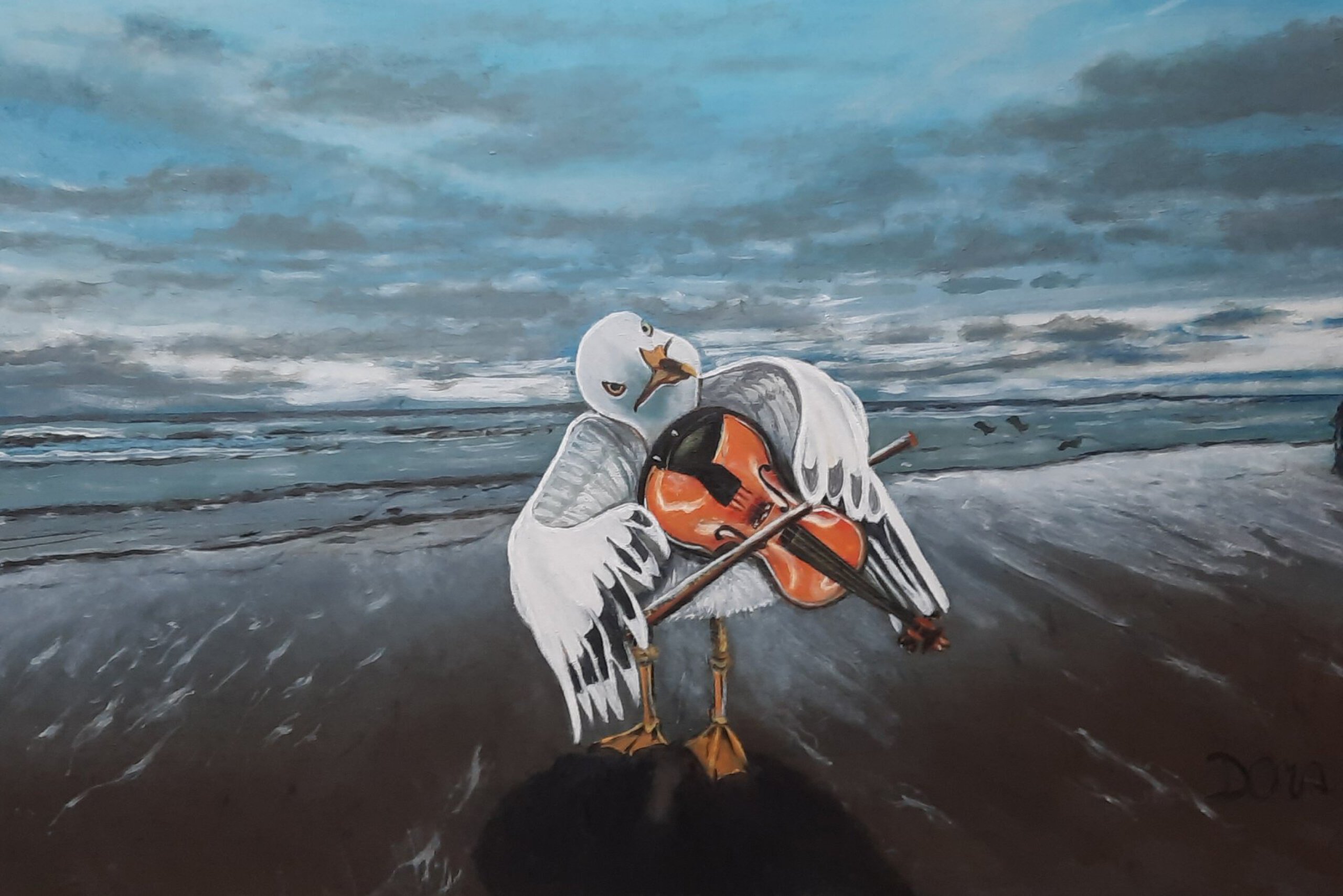 Violin de zeemeeuw speelt de mooiste aangrijpendste vioolmuziek. Staande in de zee speelt ze een ode voor iedereen die er naar luisteren wil.