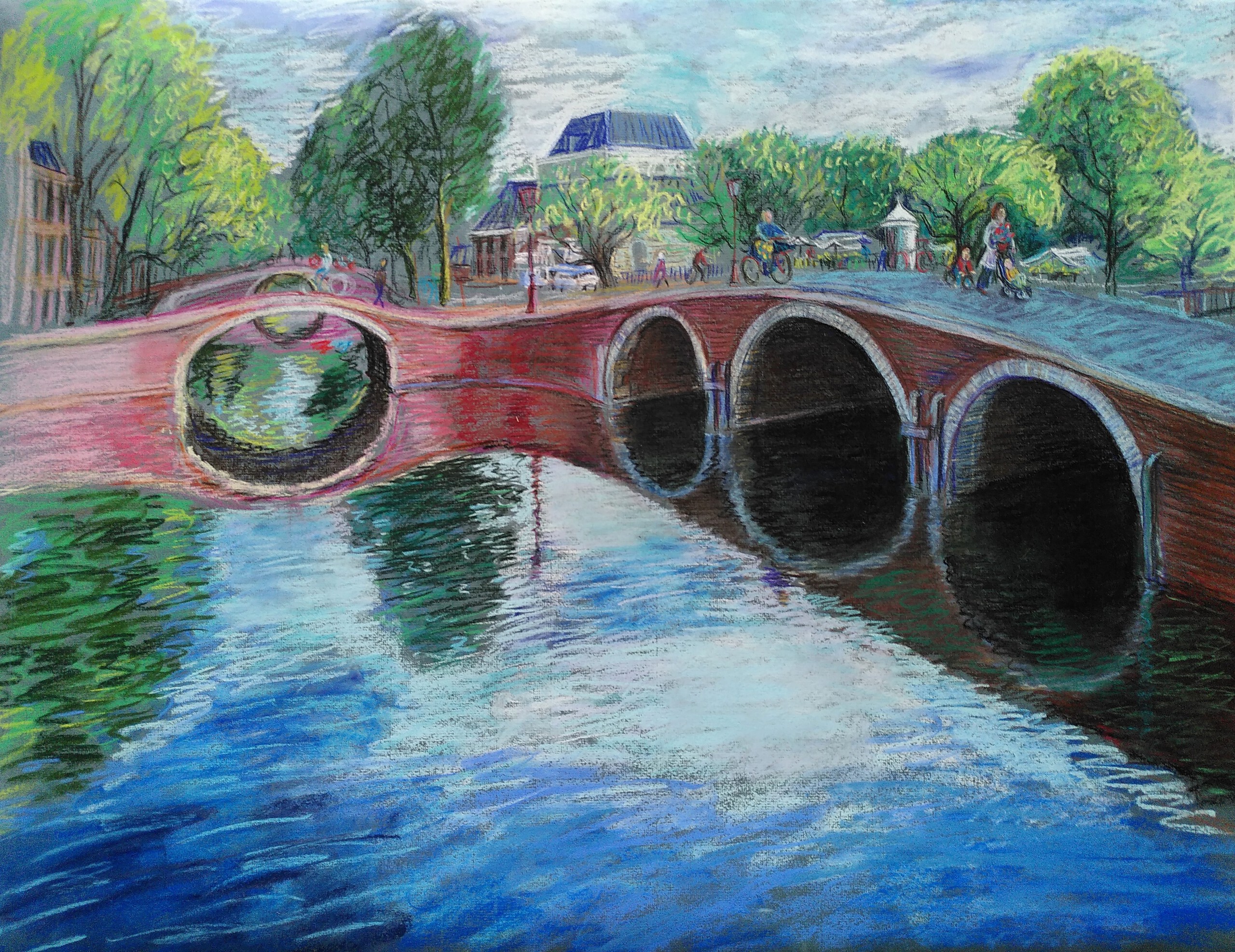Op maandag ochtend is er een plantjes markt op het Amstelveld in Amsterdam. Hier zie je de Amstelkerk en de bruggen die er naartoe lopen.