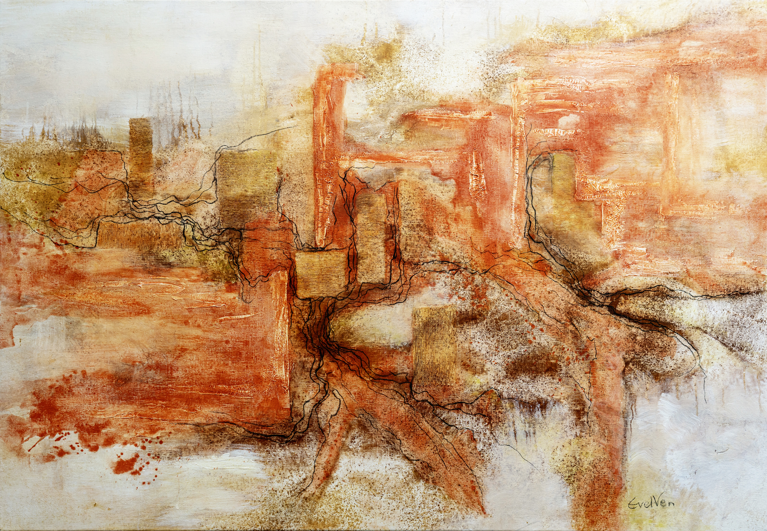 Schilderijen als wandelingen in een fictief landschap: natuurelementen die op elkaar inspelen, al dan niet met menselijke ingrepen.