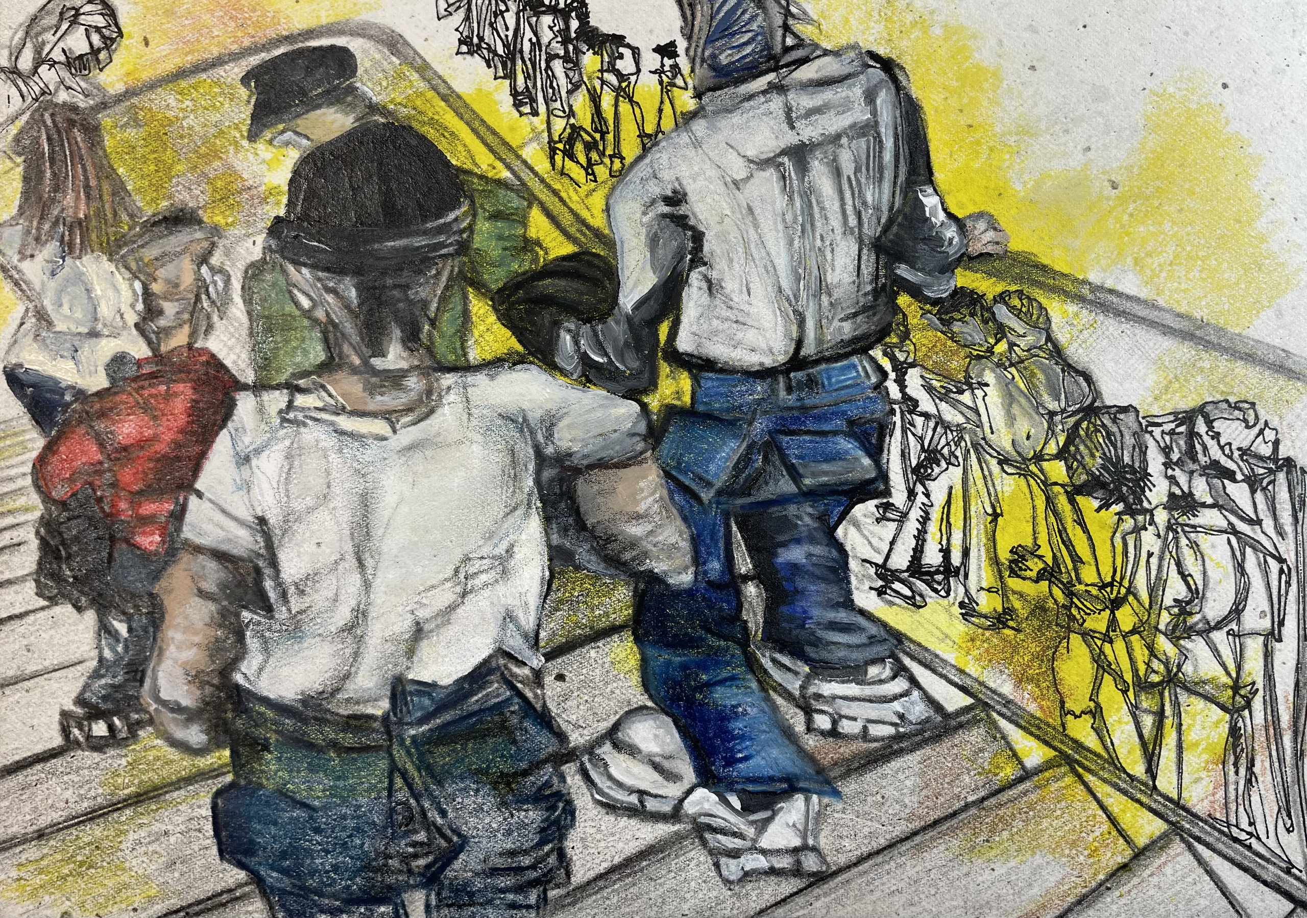 Mixed Media Papier Tekening Crowdscape