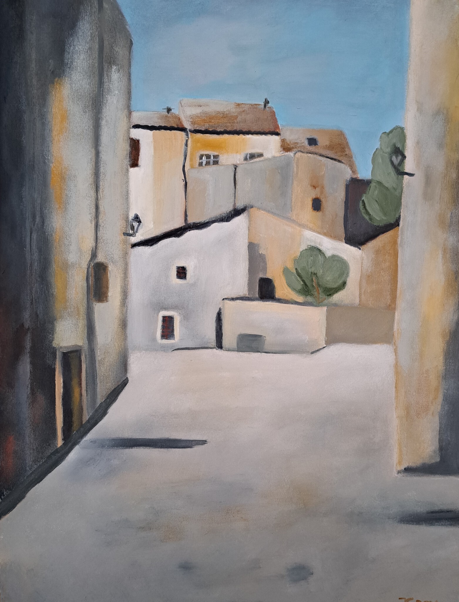 mijn schilderijen hebben hun beginpunt in een ervaring die ik heb met een bepaalde plek, dorp of stad, deze herinnering neem ik mee en probeer ik schilderend abstract figuratief vorm te geven.