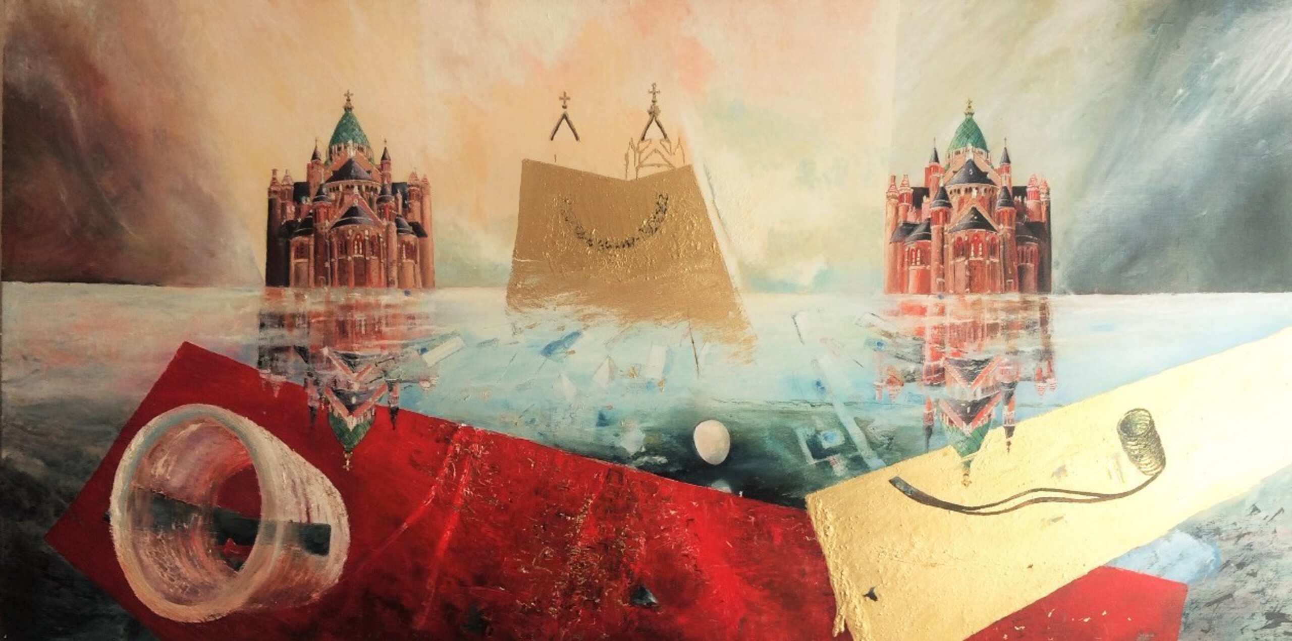 De komst van een gelukkige toekomst waarbij de hele werled verbeeld wordt in het nieuwe Jeruzalem is hier verbeeld door gebruik te maken van de Kathedrale Bavo in Haarlem (twee keer) en abstact als symbool voor de nieuwe tijd die komen zal. Afhankelijk van het licht is de in midden verbeelde nieuwe stad donker of licht. Dit geeft idee dat het beeld verweg is of dichtbij.