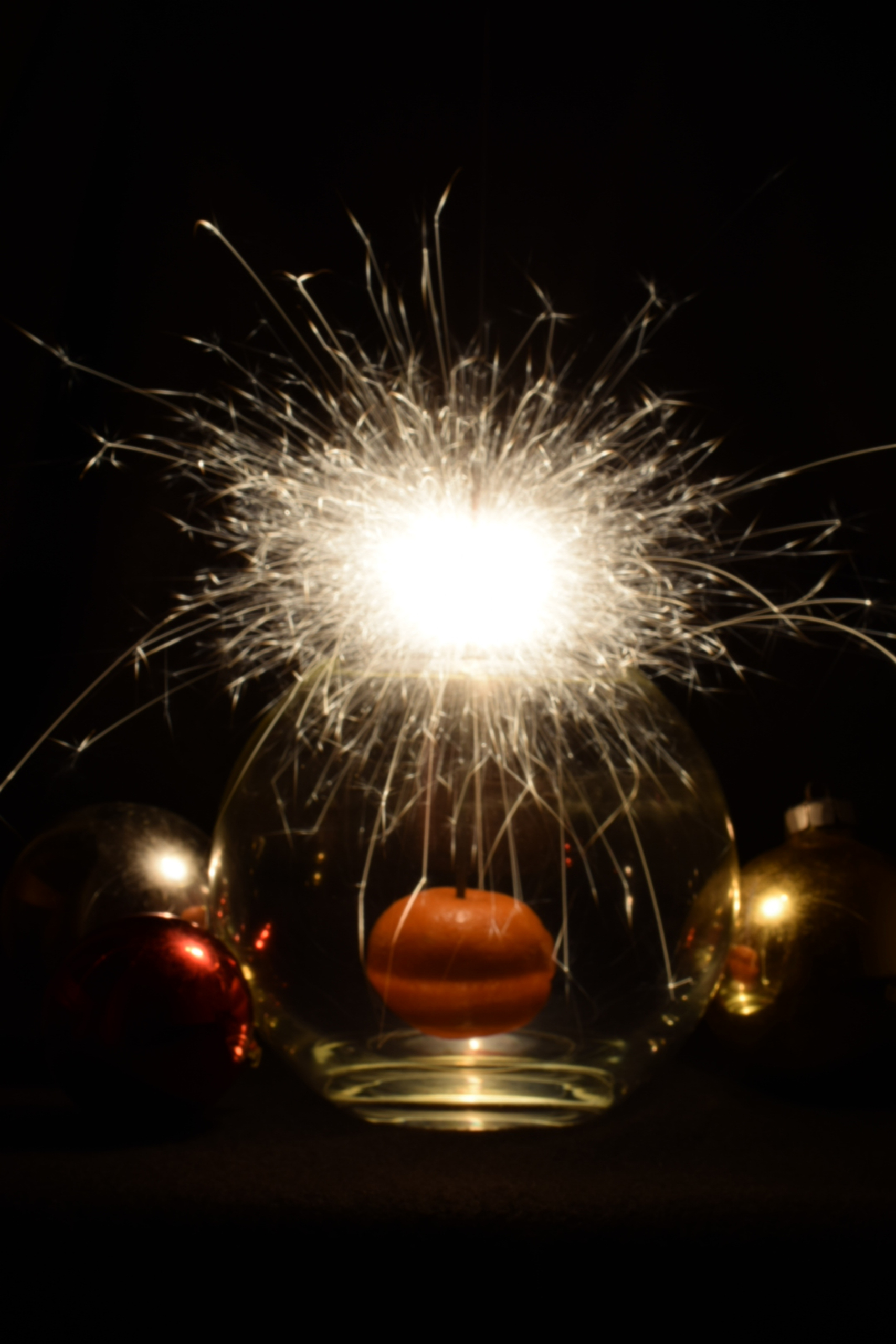 In het donker met lange sluitertijd , sterretjes en glas en mandarijn gefotografeerd