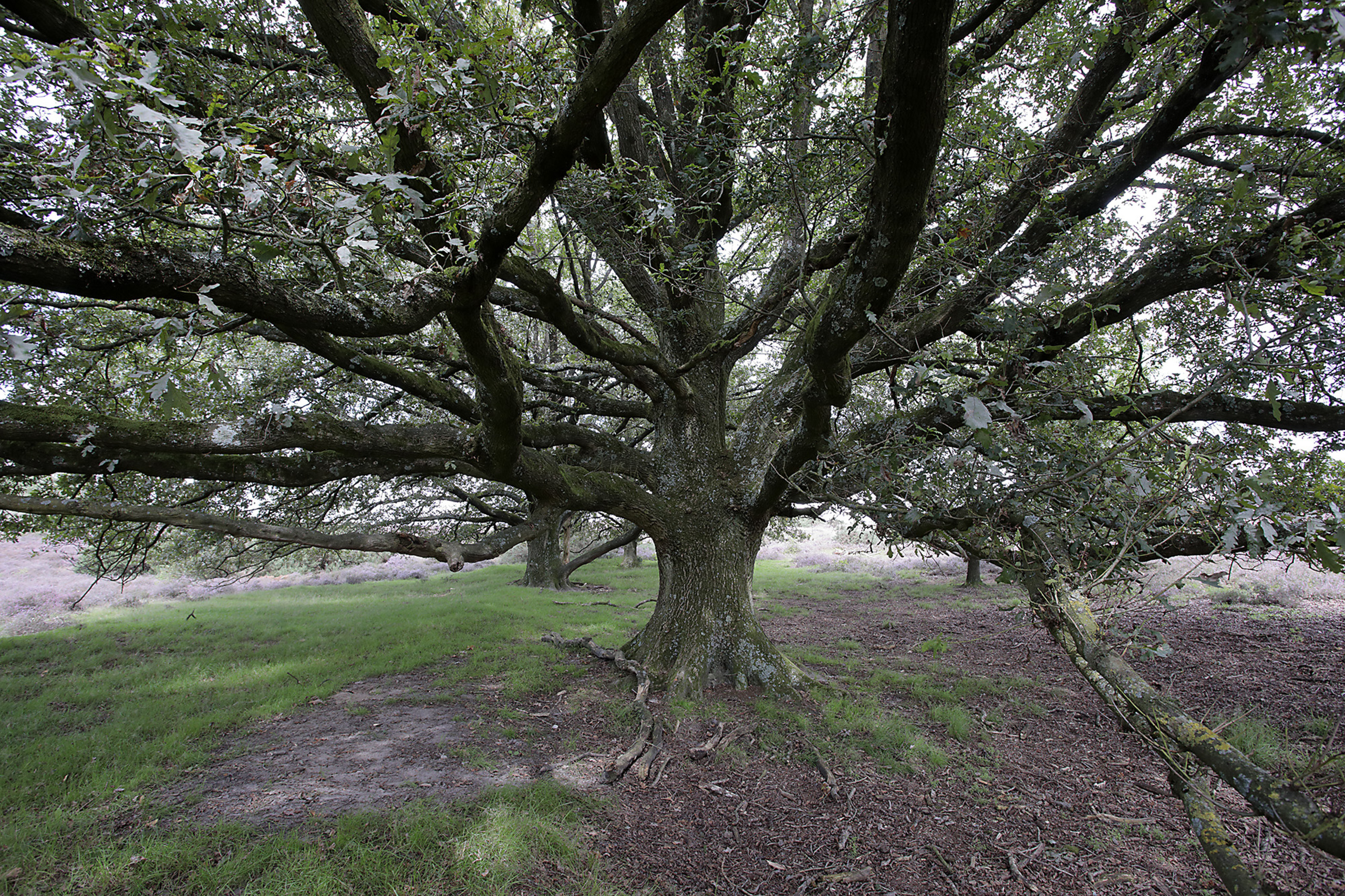 Aan de rand van de posbank zijn enorme eiken te vinden en als je daaronder kruipt lijkt het wel of je in een katedraal van bladeren en takken staat