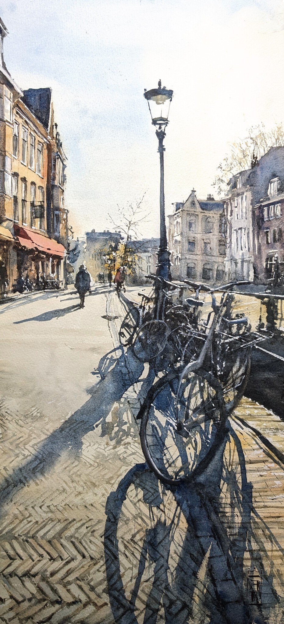 Aquarel Realistisch Fiets Fietsen Watercolor Stad Gracht Stadsgezicht City Utrecht Bicycles Oudegracht