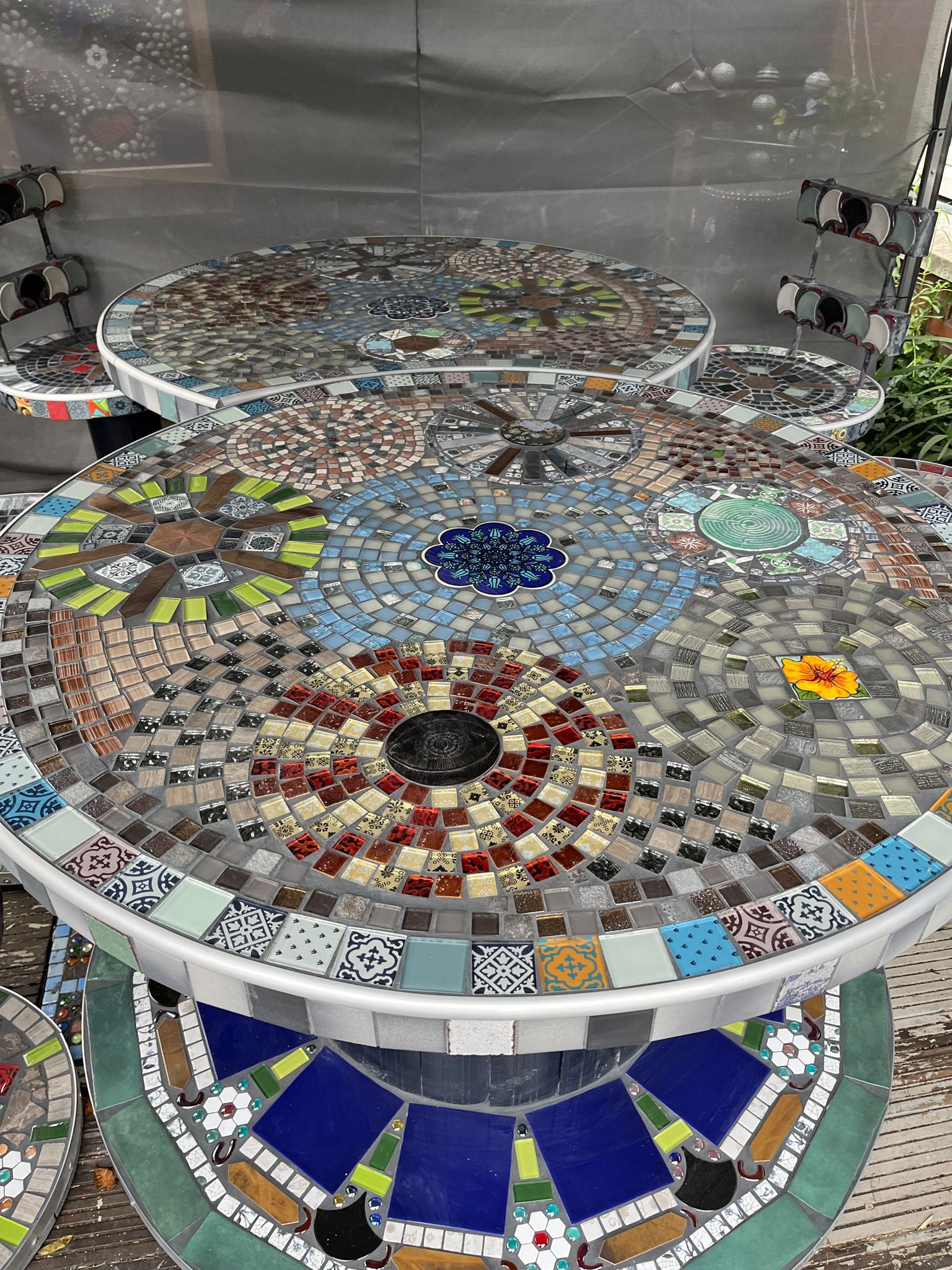 Van houten kabel haspels een dubbele tafel en 6 stoelen gemaakt. Hierbij zijn metalen randen aangebracht als bescherming van de randen. Het mozaïek werk is uitgevoerd in verschillende materialen: tegels van keramiek en glas.
