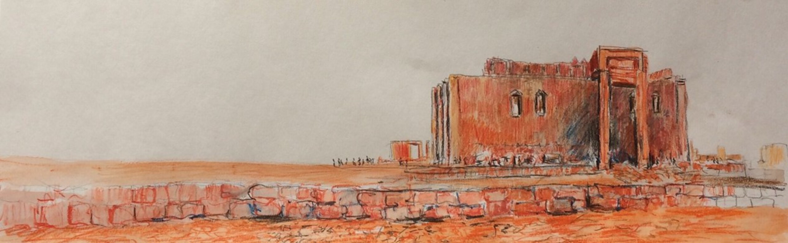 De Beltempel, hier getekend voor de verwoesting door IS en in 2017 aquarel van gemaakt