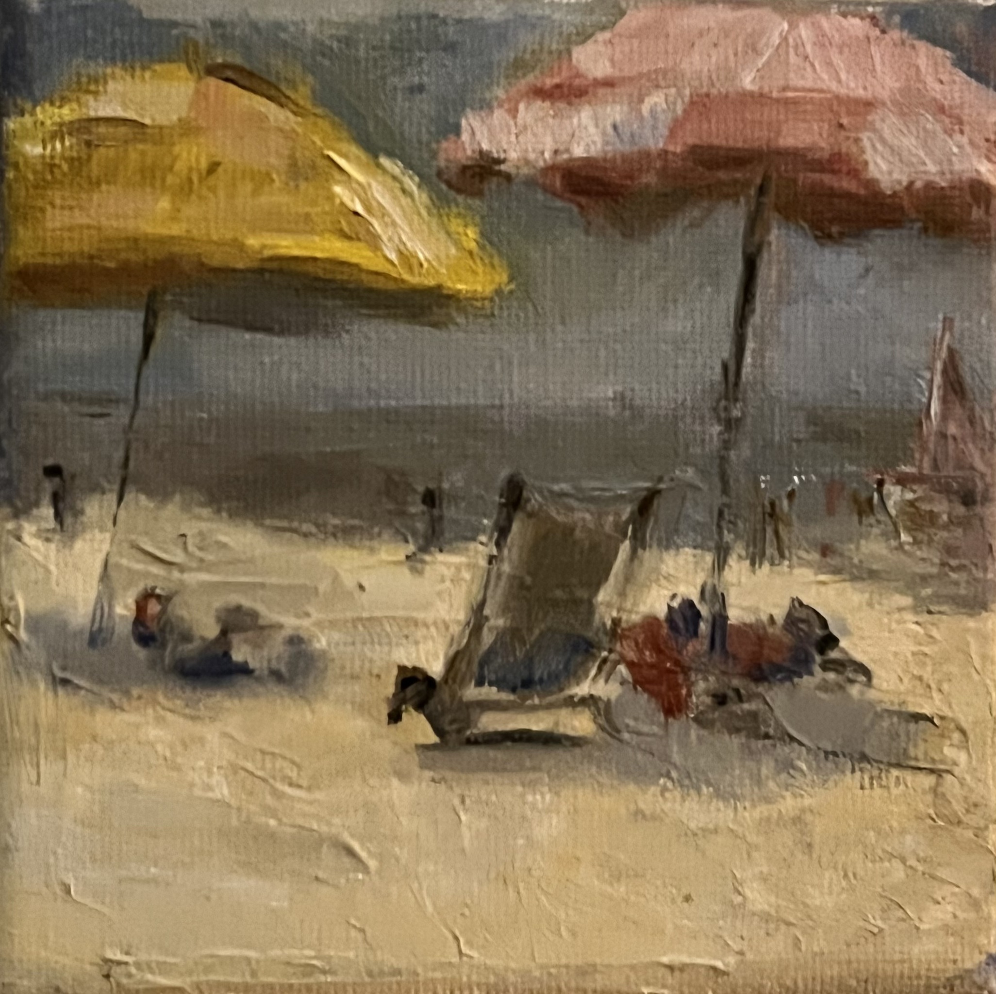 Zee Zon Strand Geel Roze Zonnig Romantisch Zomer Parasol Impressionistisch Strandtafereel Minischilderij Petitpeintre