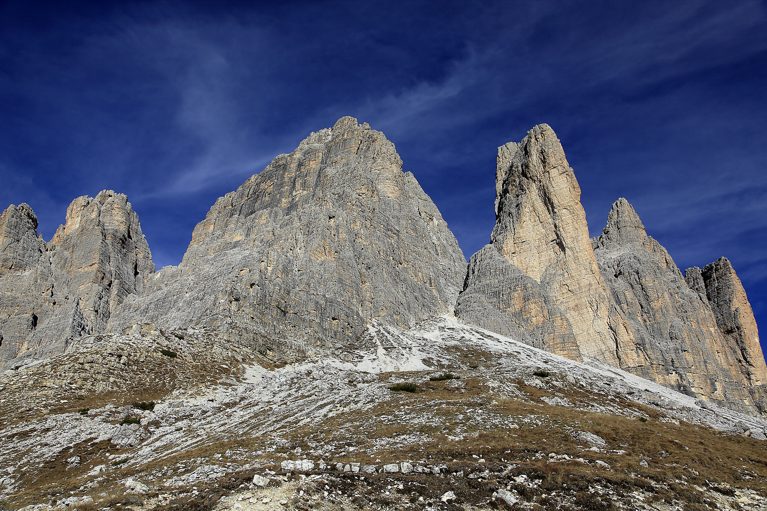 een bekende plek in de dolomieten zijn de drei Zinnen, of de drie gezusters. Nu eens van de voorkant