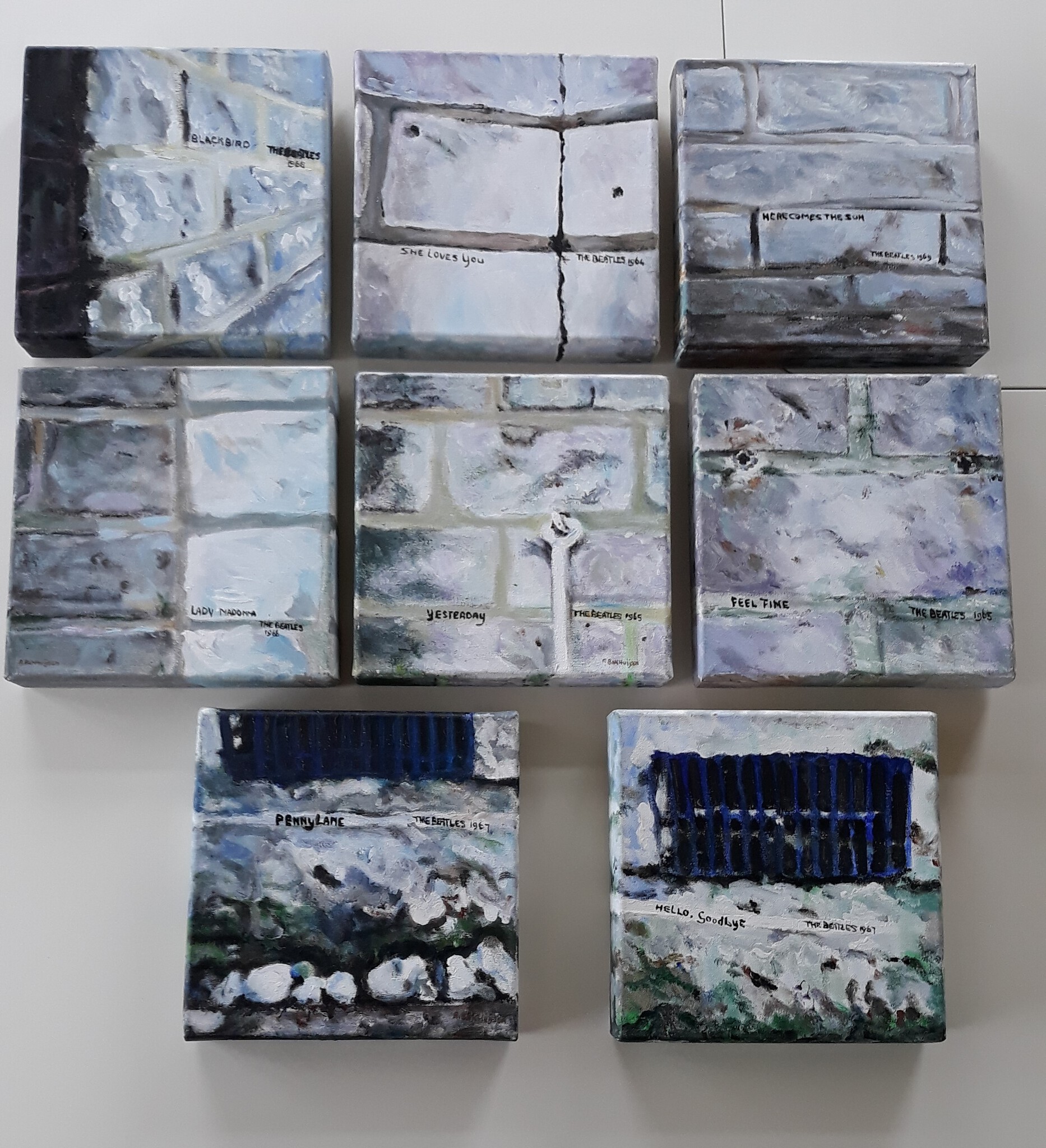 8 beatles steentje 1964 t/m 1969 afmeting 20 x 20 x3 cm , agrylverf.