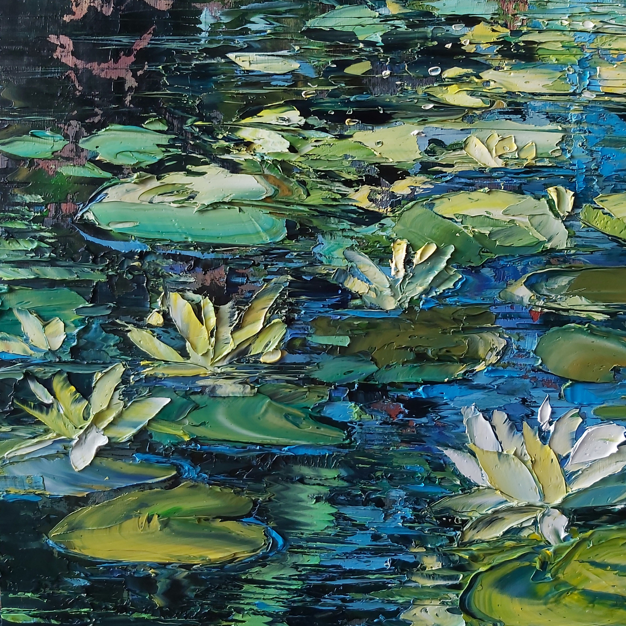 Geschilderd met paletmessen en pasteuze verf (impasto) in alla prima techniek. KLIK OP DE AFBEELDING VOOR EEN CLOSE-UP.