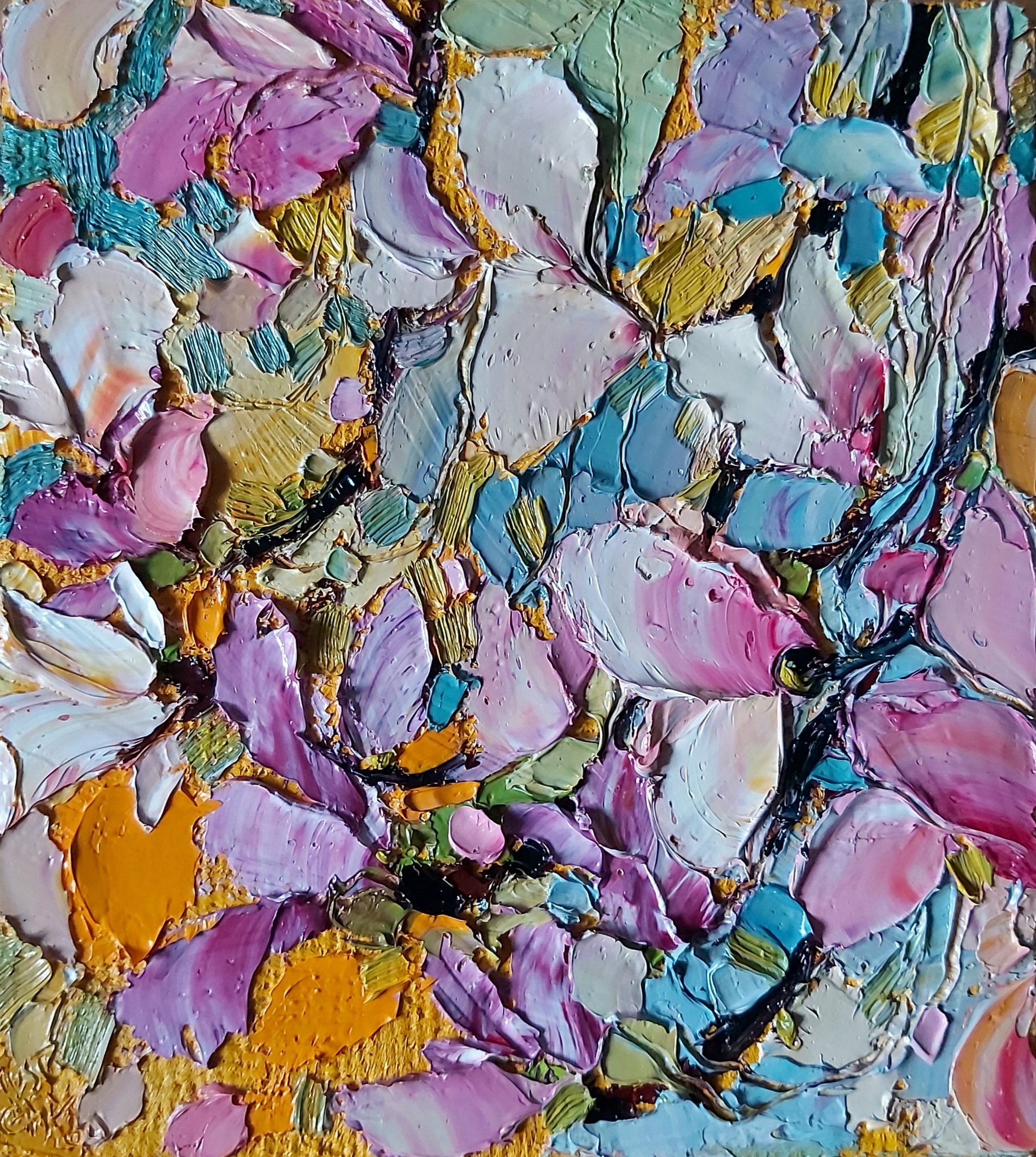 Geschilderd met paletmessen en pasteuze verf (impasto) in alla prima techniek. KLIK OP DE AFBEELDING VOOR EEN CLOSE-UP.