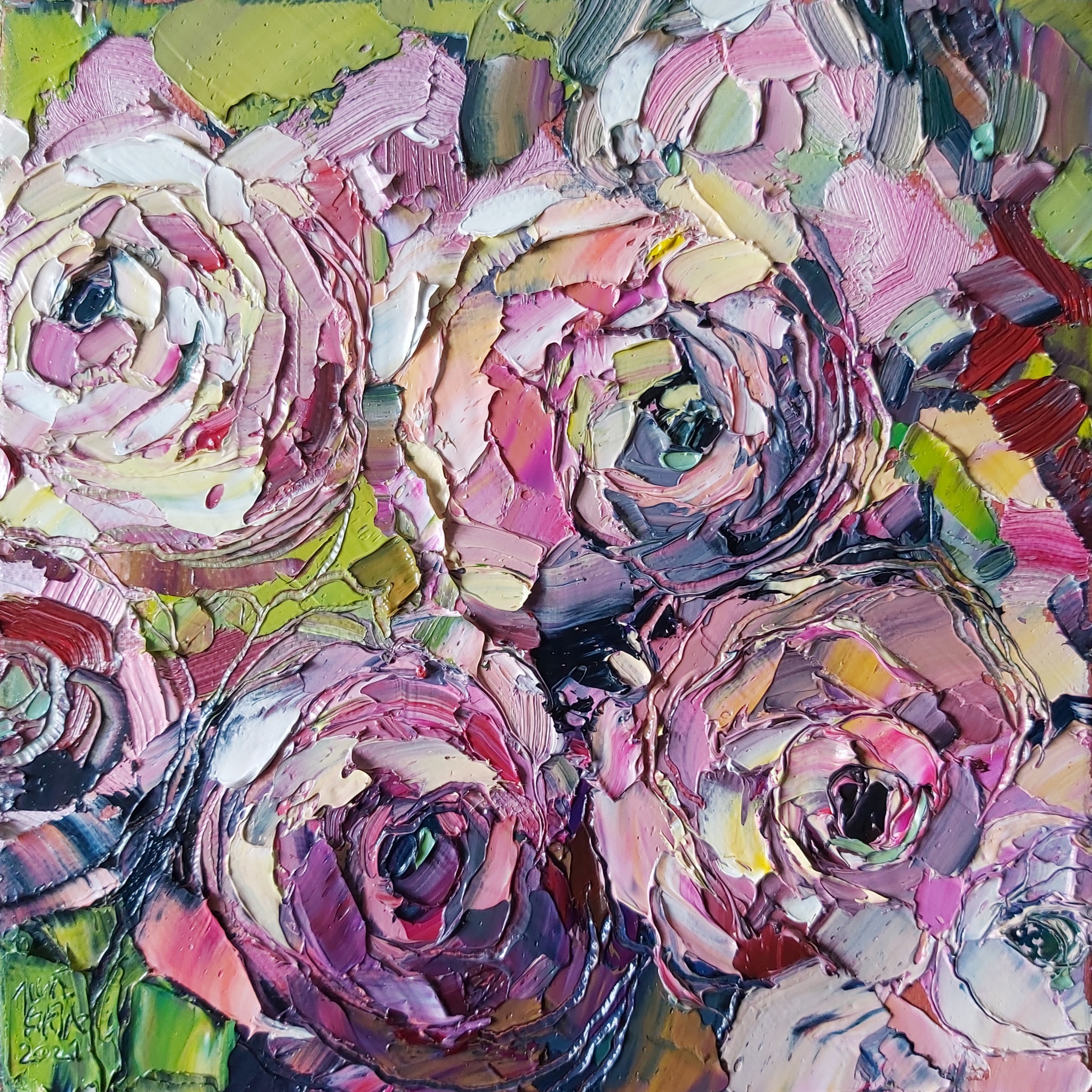 Geschilderd met paletmessen en pasteuze verf (impasto) in alla prima techniek. KLIK OP DE AFBEELDING VOOR EEN CLOSE-UP.