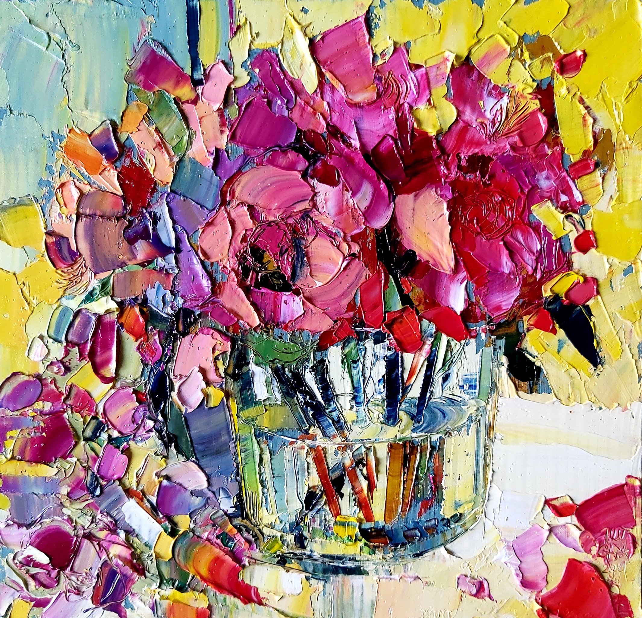 Geschilderd met paletmessen en pasteuze verf (impasto) in alla prima techniek. KLIK OP DE AFBEELDING VOOR EEN CLOSE-UP.
