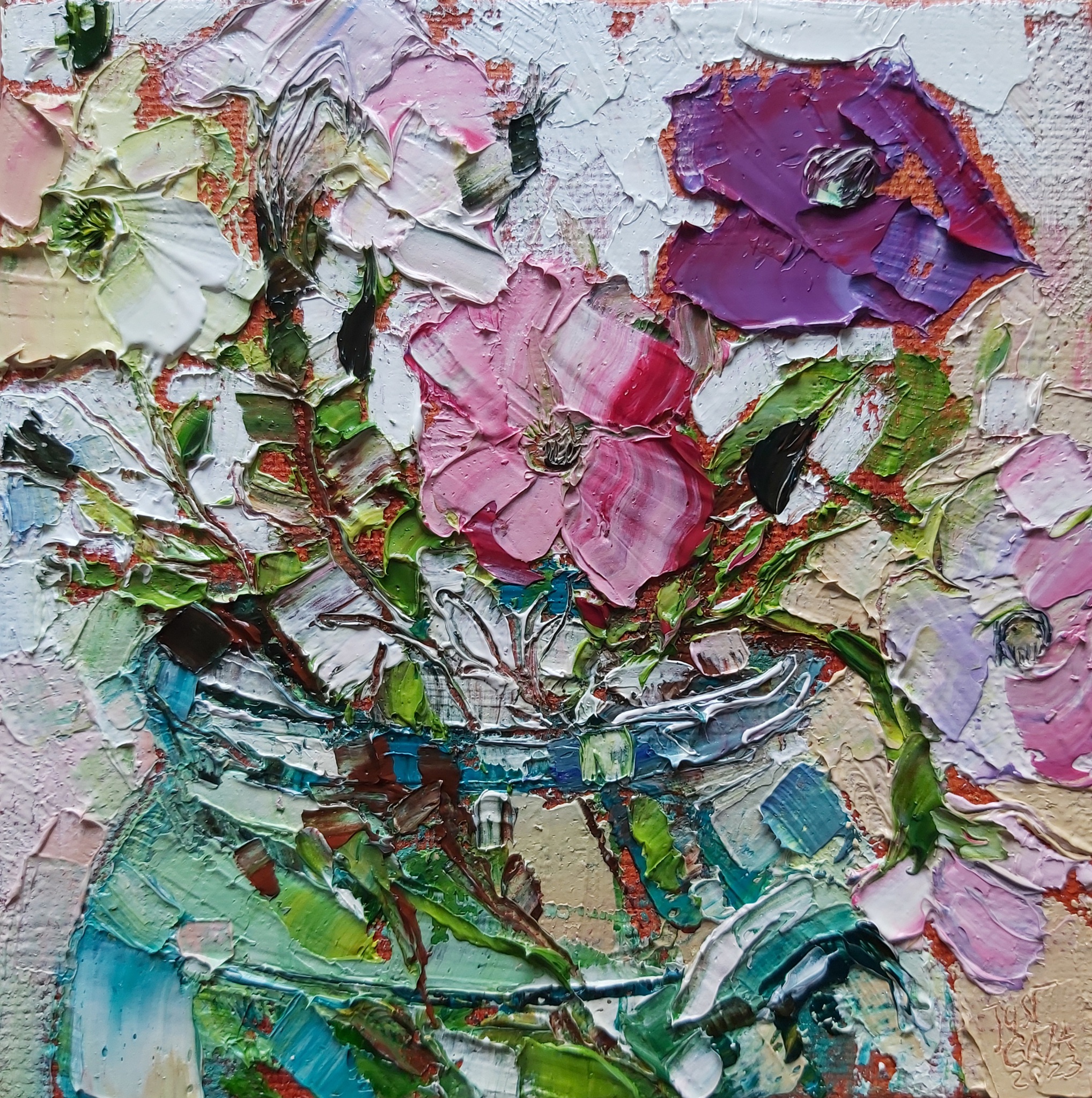 Schilderij Abstract Paars Bloemen Art Kleurrijk Oil Canvas Olieverf Kunst Bloem Violet Still Life Flowers Figurative Stillevens Pink Artist Impression Kleine Miniatuur Happy Woonkamer Levendig