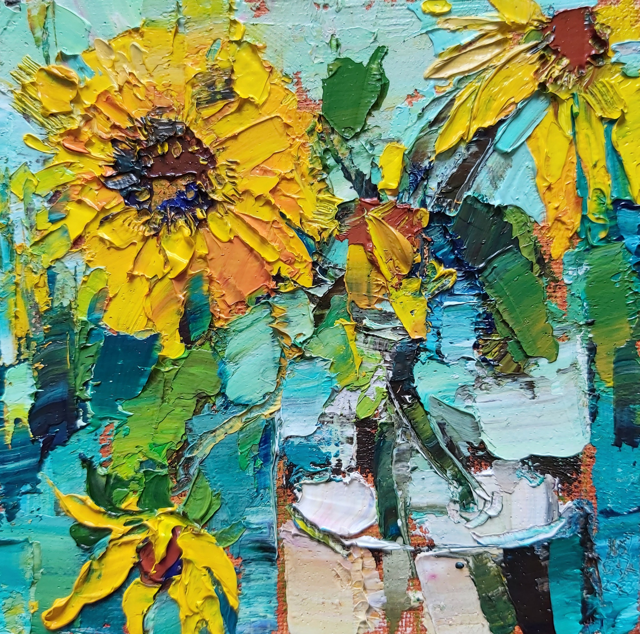 Geschilderd met paletmessen en pasteuze verf (impasto) in alla prima techniek. KLIK OP DE AFBEELDING VOOR EEN CLOSE-UP.