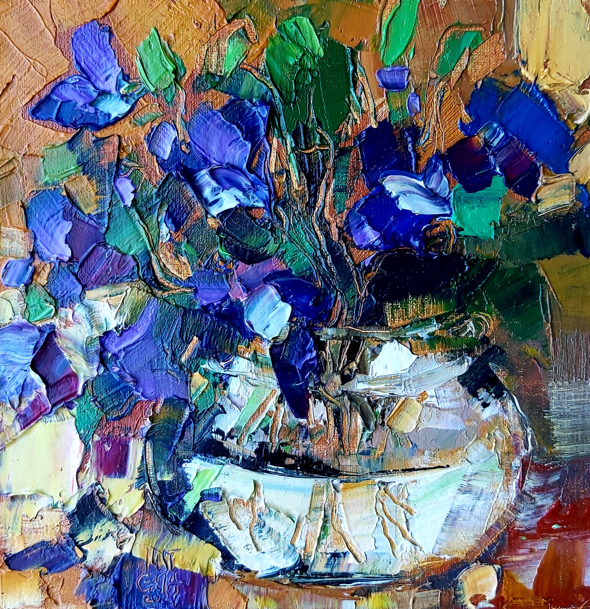 Schilderij Abstract Paars Bloemen Art Kleurrijk Oil Canvas Kunst Bloem Still Life Flowers Figurative Stillevens Artist Impression Kleine Miniatuur Happy Woonkamer Viooltjes Floral Colourfull Impasto