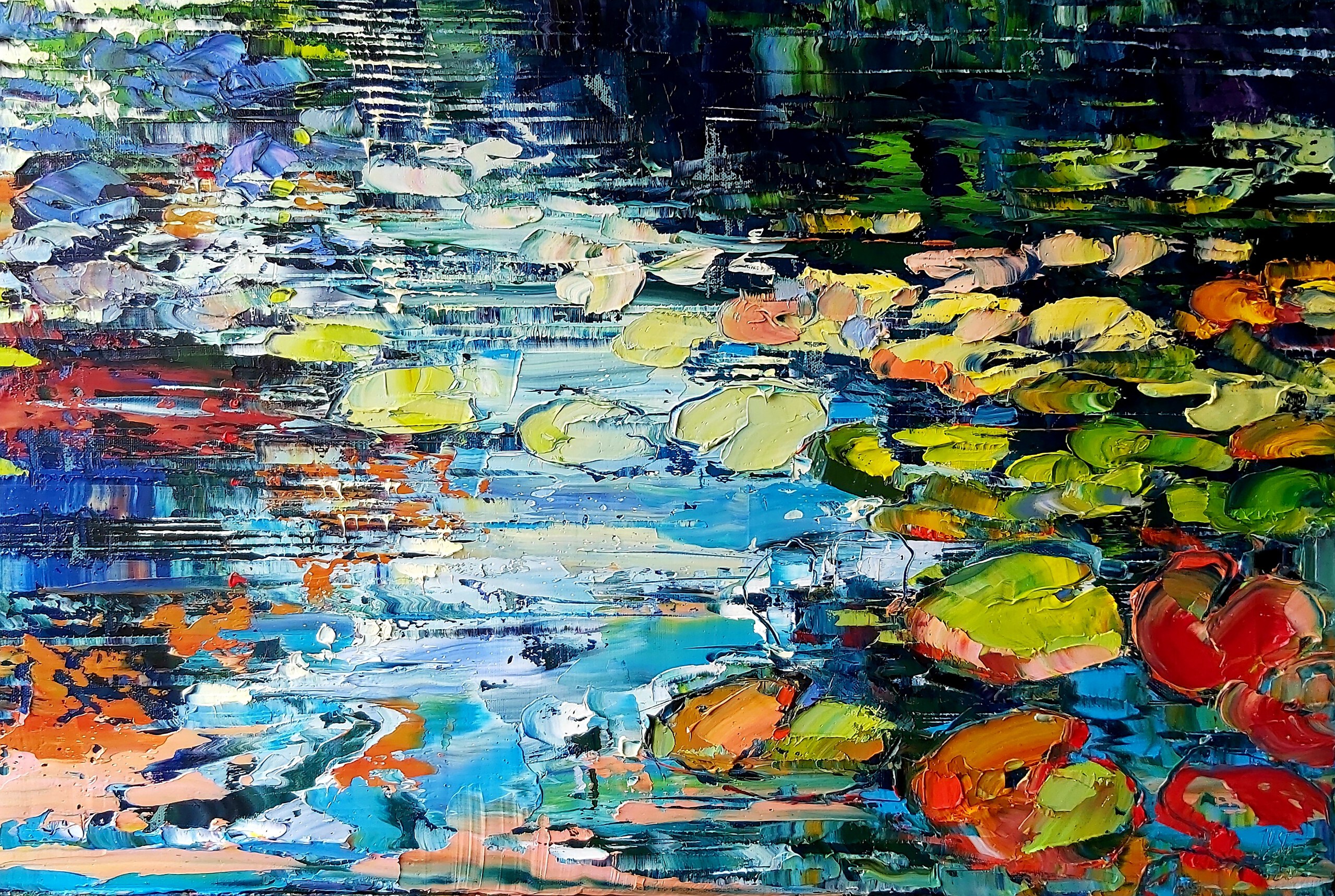 Water Kleuren Op Lotus Meer Waterlelies Driven Happy Painting Sloot Reflectie Herfst Bloemen Bladeren Impasto Oileverf Schilderij Paletmess Eindfase Herfsttij Nadagen Lotos Groen Blauw Rod