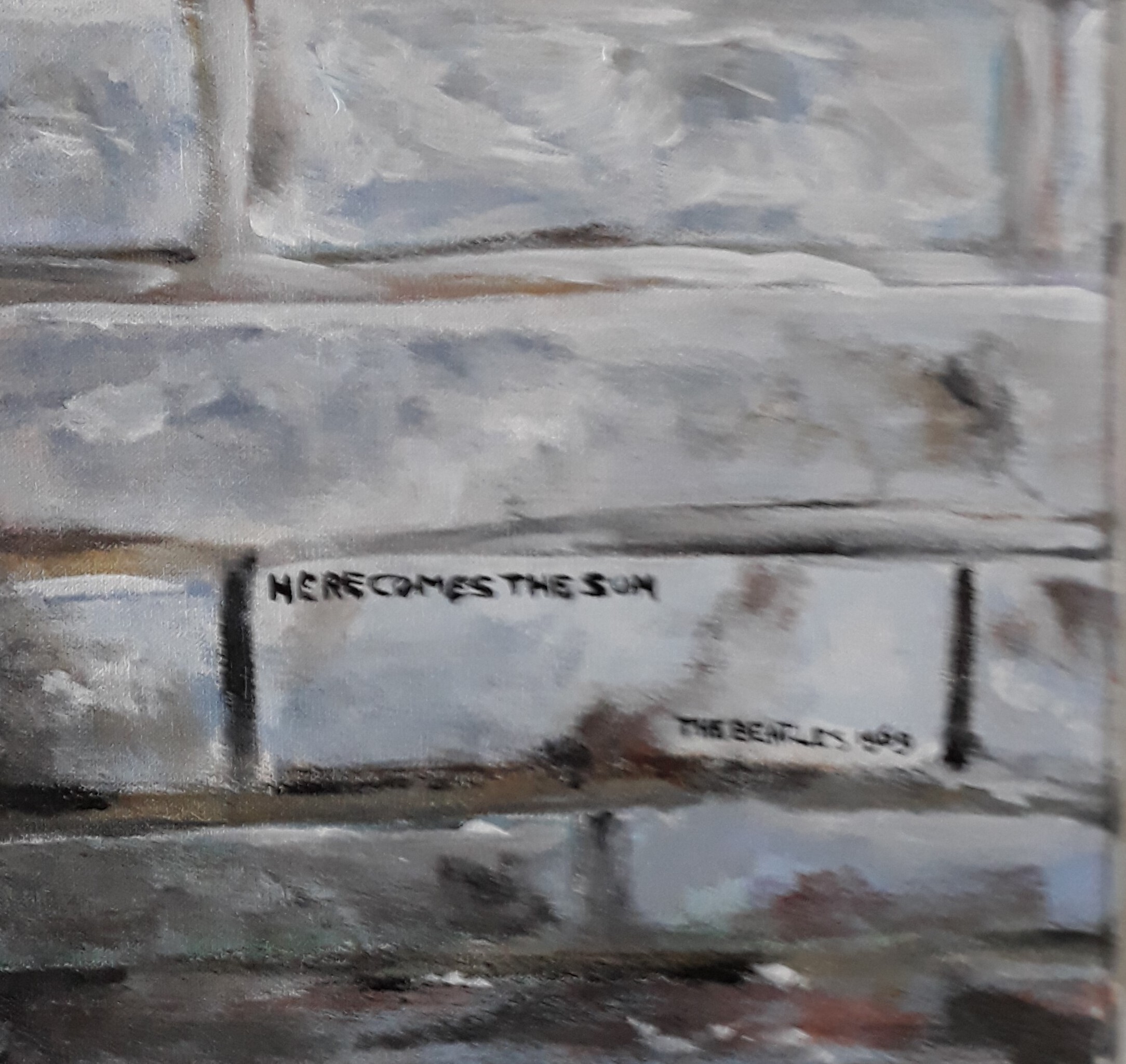The Beatles steentje "Here comes the sun"1969, op doek met acrylverf, afmeting 20 x20 x 3 cm.