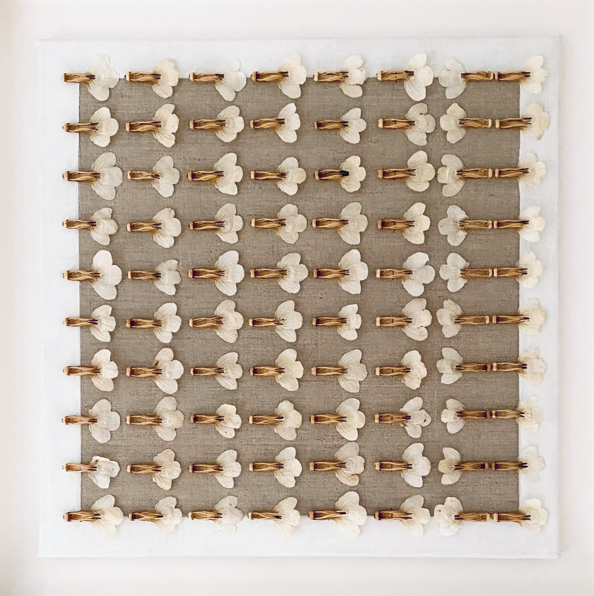 ordening, symmetrie, architectuur zijn associaties die dit werk oproepen. Het werk is gemaakt op linnen canvas en zit in een eikenhouten lijst met museumglas.