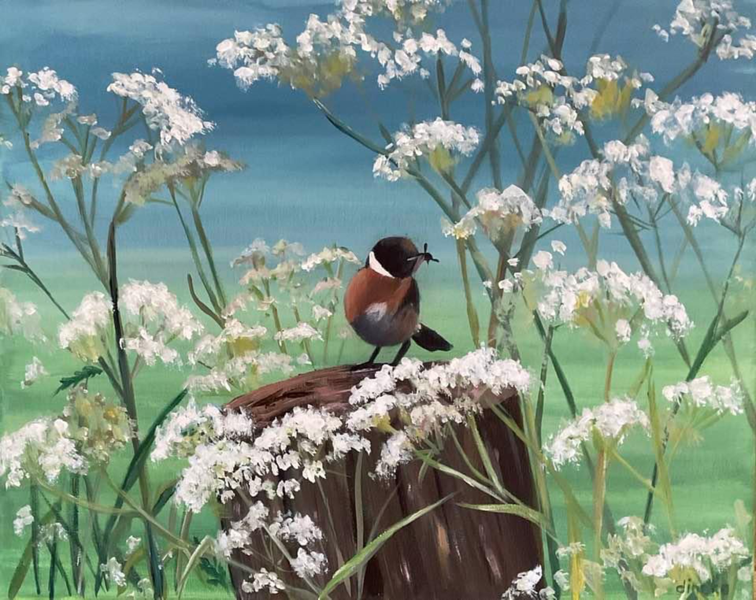 Roodborsttapuit tussen het fluitekruid