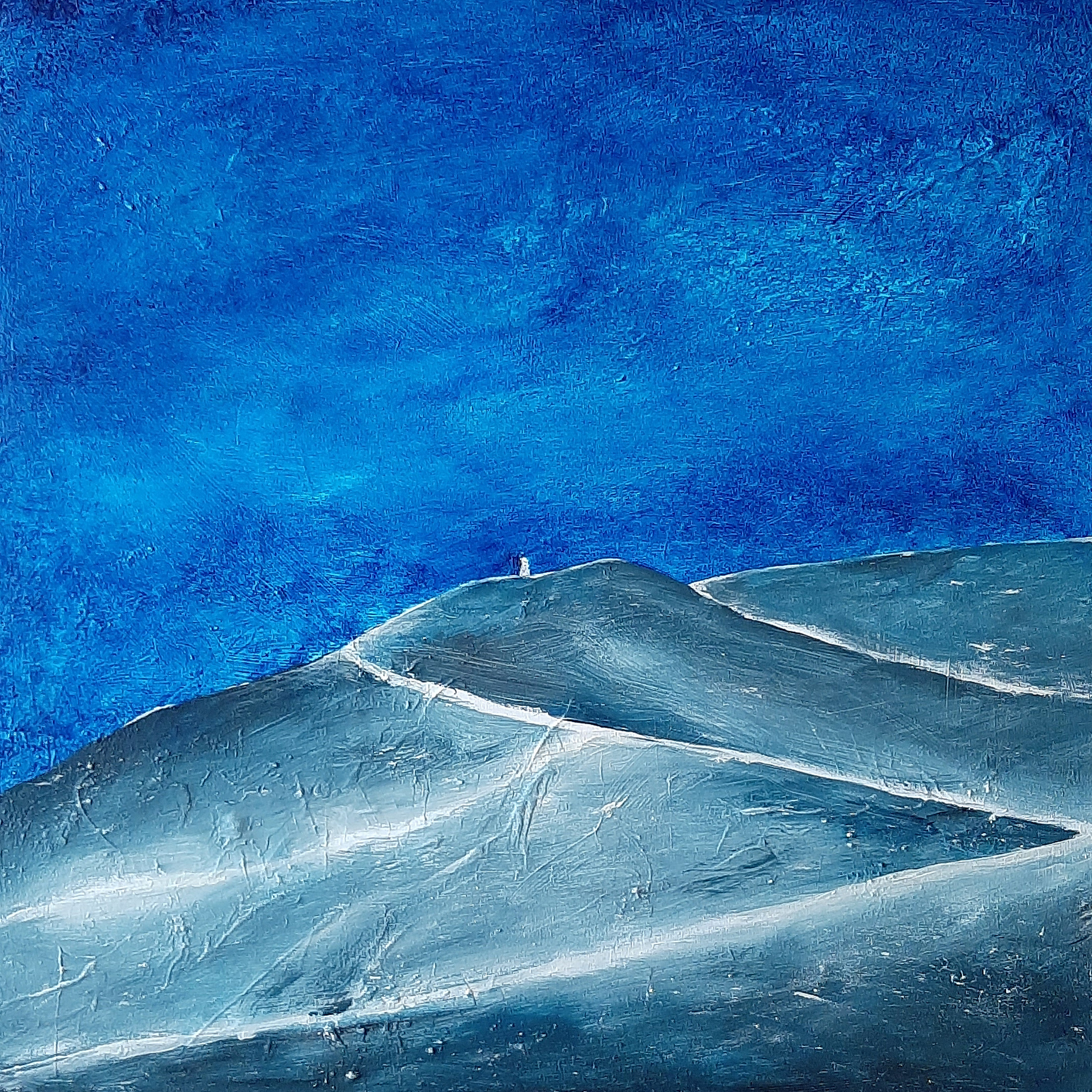 In 2013 naam ik me voor een reeks Mont Ventoux te starten, op doek, op paier en als aquarel. Nadat ik in 2022 al MON VENTOUX geschilderd had, inmiddels verkocht. In deze Mont Ventoux 2 lijkt de herfst al in aantocht. De berg maakt zich in alle rust op voor de naderende winter. De machtige berg in het zuiden van Frankrijk, de renners in Tour de France vrezen deze gigant. Verschillende keren was ik er boven op. Soms werd me de toegang in de vroege lente (mei) nog versperd vanwege de sneeuw. Een intrigerende, bijna iconische berg.