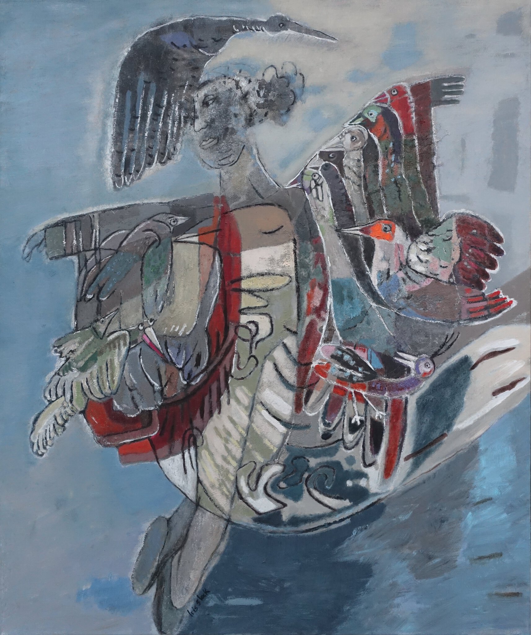 Een vrouw die danst met vele vogels. Zo vrij als een vogel, in de wolken.