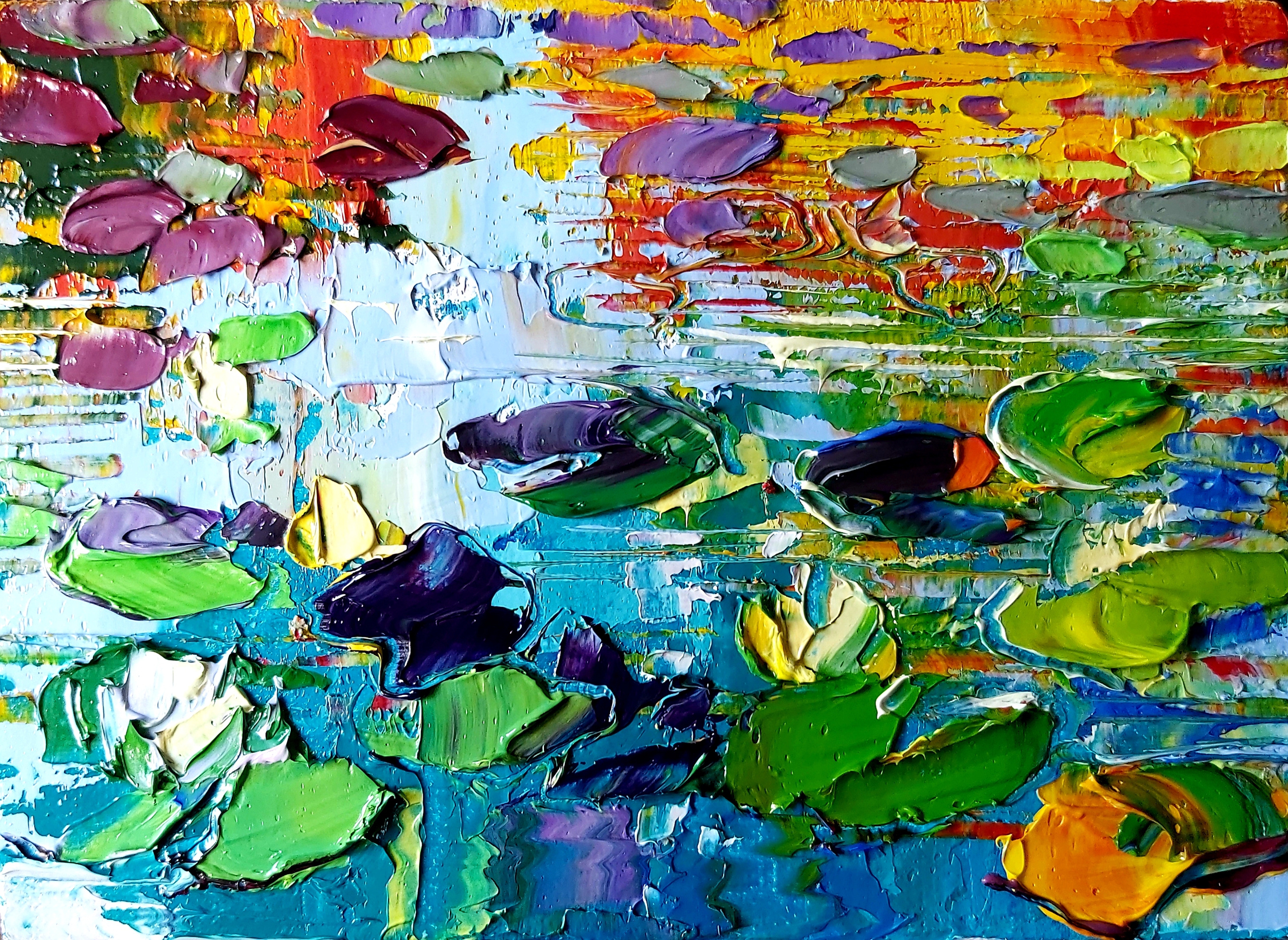 Schilderij Geel Blauw Groen Bloemen Water Kleuren Painting Bladeren Herfst Reflectie Lily Meer Sloot Lake Forest Waterlelies Colour Happy Colourfull Rod Impasto Oileverf Waterlily Lotos