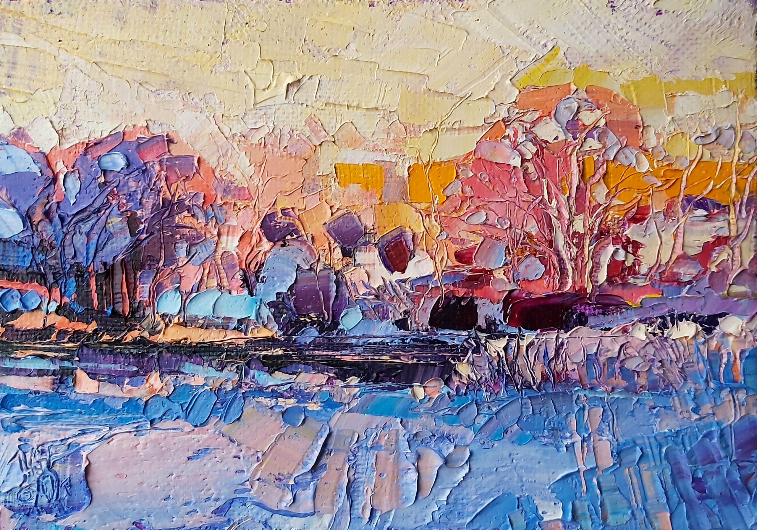 Schilderij Abstract Modern Art Kleuren Kleurrijk Oil Canvas Kunst Painting Winter Landscape Figurative Artist Impression Trees Snow Sneuwforest Colour Happy Woonkamer Daily Colourfull Interior Impasto