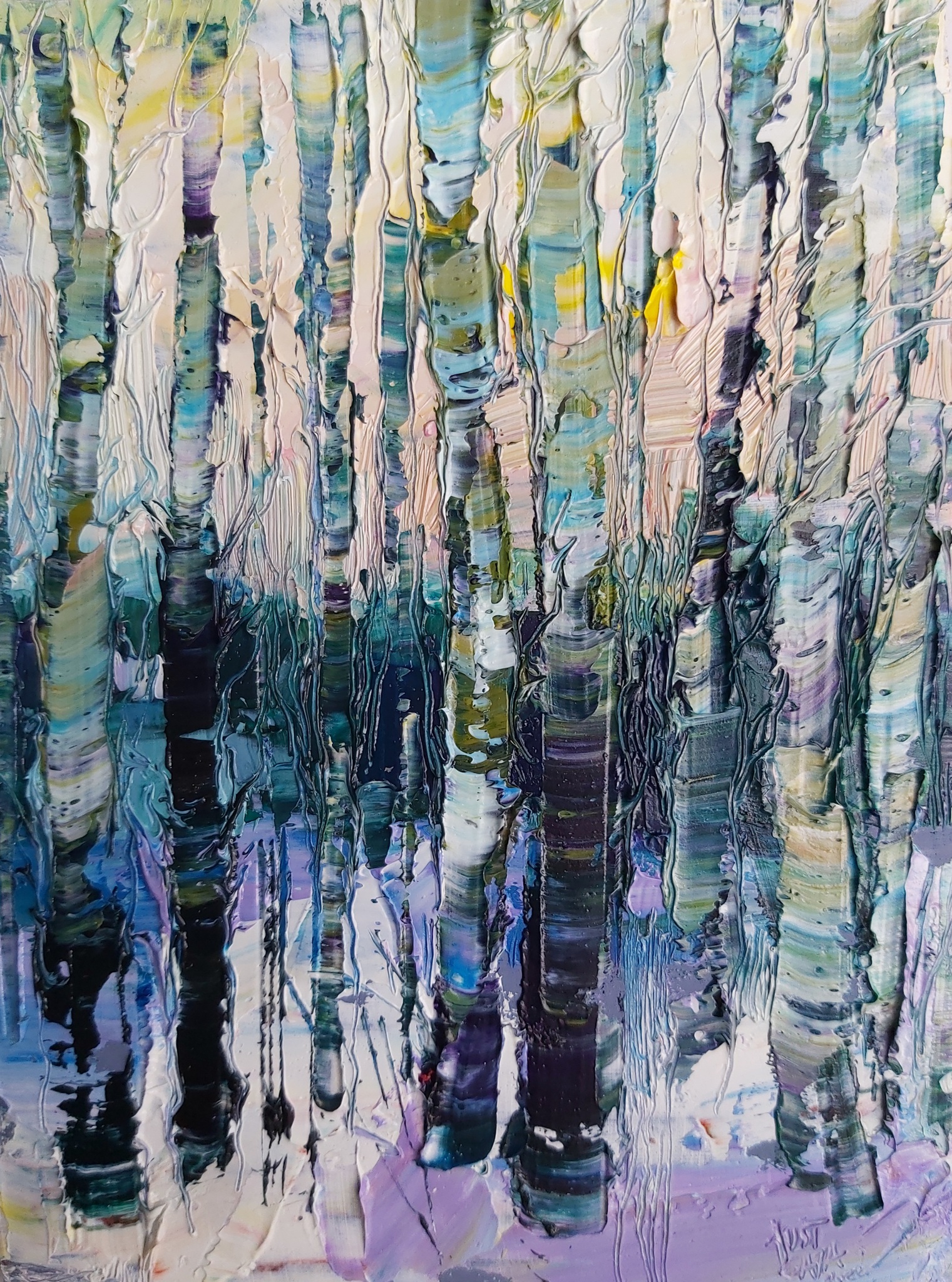 Winter Zonsopgang Sneeuw Sunrise Snow Tinten Blauw Boom Bomen Trees Forest Happy Painting Impasto Oileverf Schilderij Colourfull Oil Canvas Kleurrijk Figurative Art Kunst Kunstwerk Interior