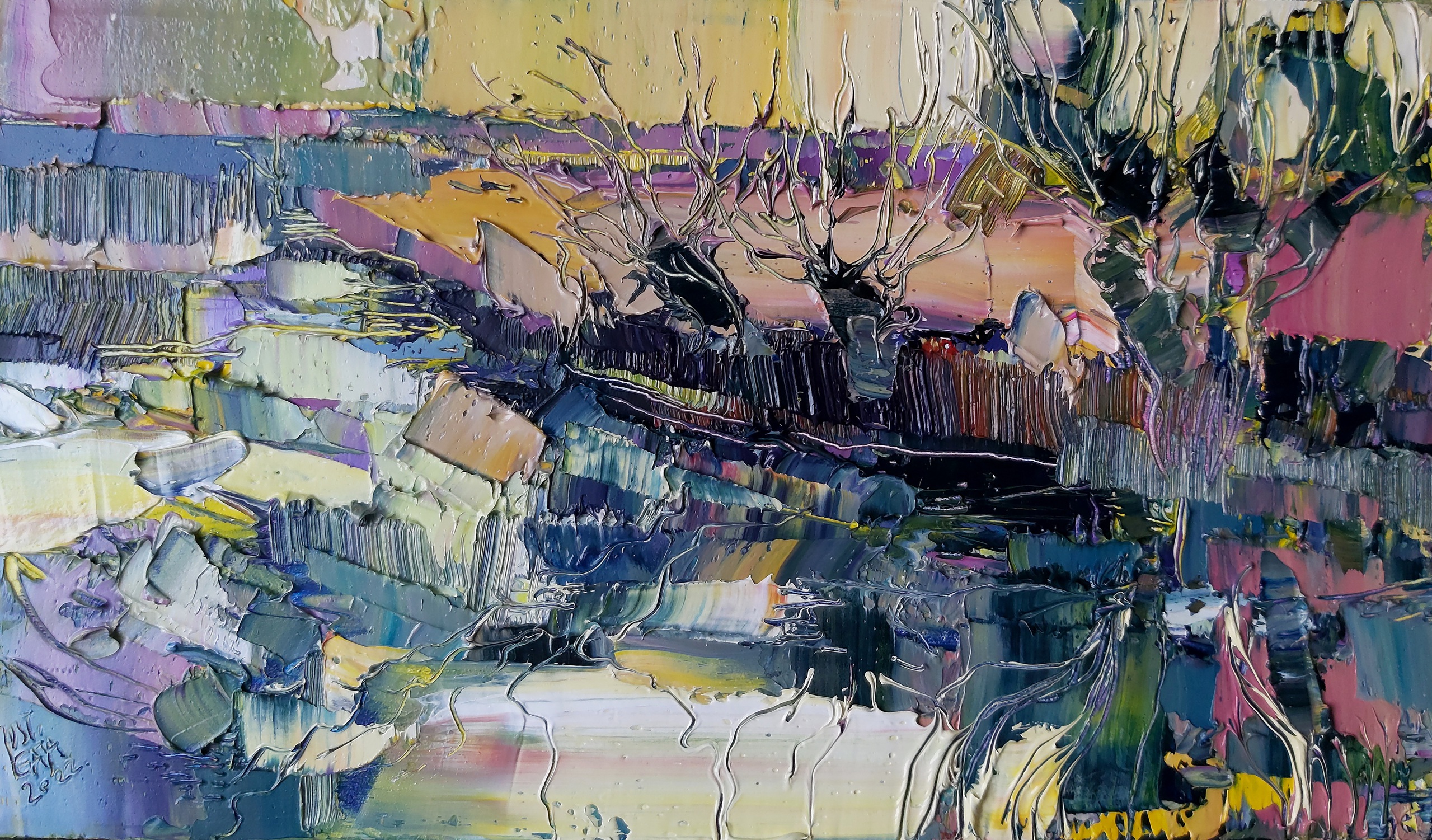 Winter Zonsopgang Sneeuw Sunrise Snow Tinten Blauw Boom Bomen Trees Forest Happy Painting Impasto Oileverf Schilderij Colourfull Oil Canvas Kleurrijk Figurative Art Kunst Kunstwerk Interior