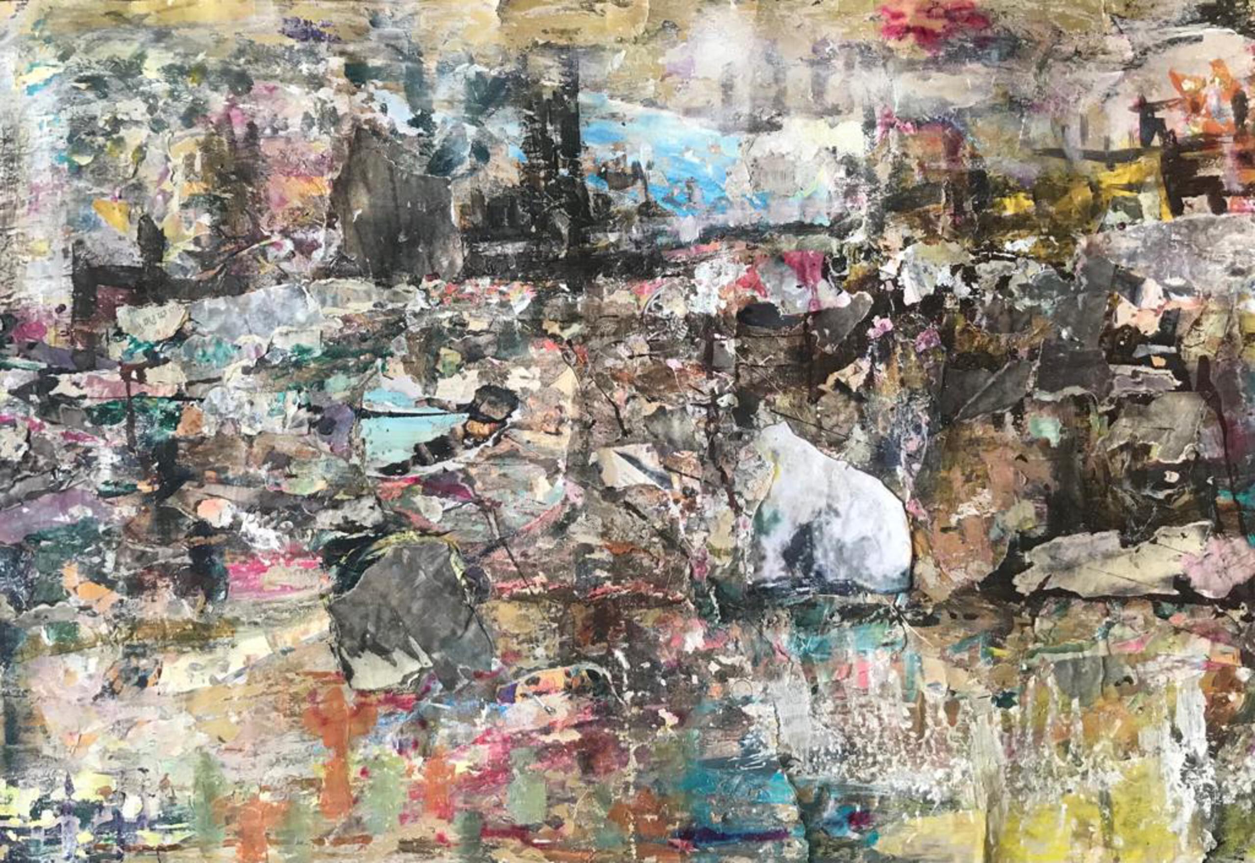 Ik ben Hanneke en heb 23 jaar in de Belgische Ardennen gewoond, waar ik een eigen mozaïek-atelier had. Toen ik in 2012 terugkwam naar Amsterdam, ben ik overgegaan op een andere creatieve werkvorm, met papier, verf, inkt en krijt, waarbij ik op een intuïtieve manier begin te experimenteren zonder te weten waar ik uitkom. Het gaat evenzeer om het proces en het plezier als om het uiteindelijke resultaat.