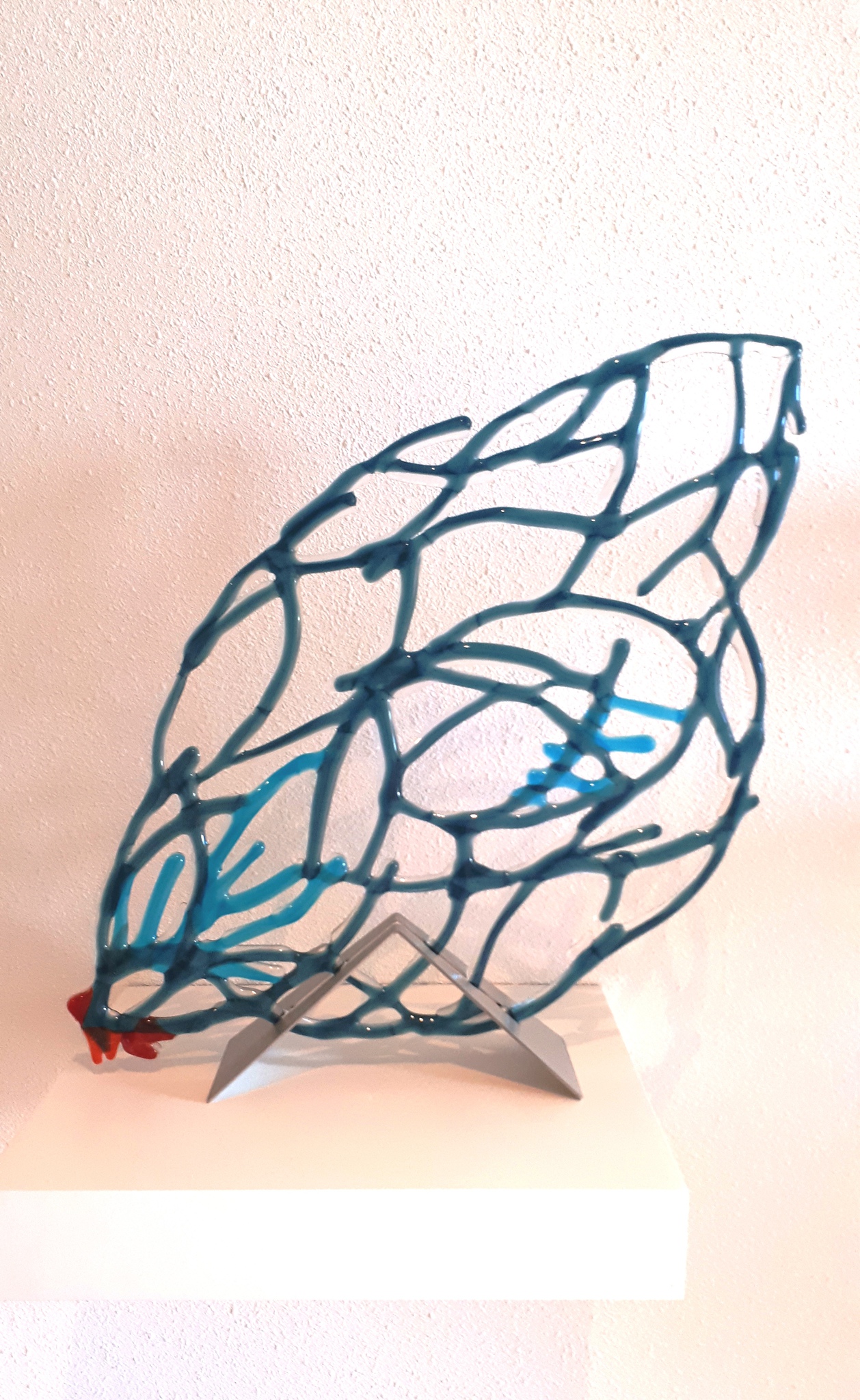 Op luchtige wijze in glas gevatte kip van blauw en turquoise glas.