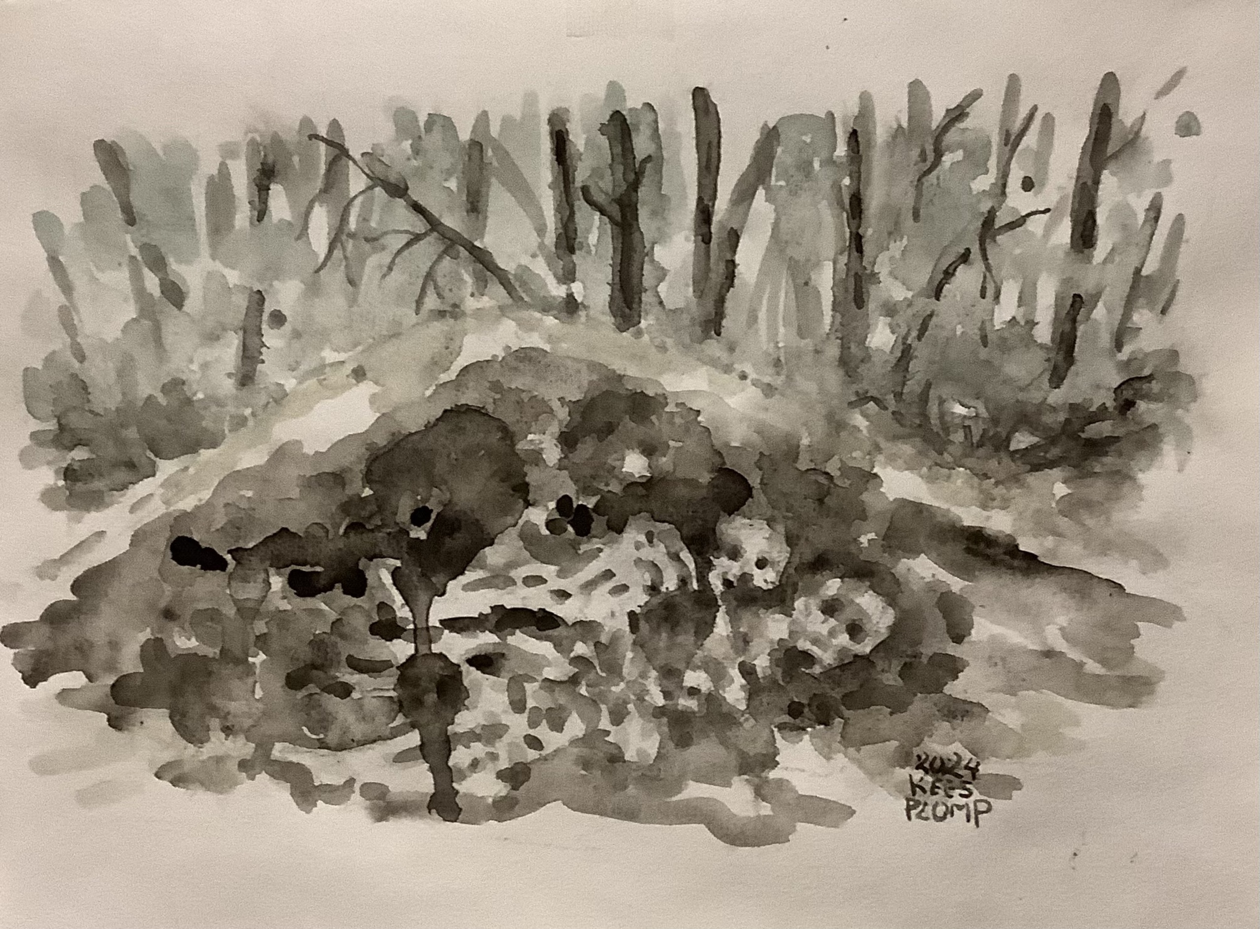 Kees Plomp, Oud-Beijerland, 1949. Beeldend kunstenaar, schilderen, aquarelleren en tekenen. Na de middelbare school ging ik naar de Rotterdamse kunstacademie. Wanneer een onderwerp mij boeit levert dit meestal een reeks werkstukken op in verschillende materialen en van diverse afmetingen. In het proces van eerste schets naar schilderij wordt de natuurgetrouwe weergave minder belangrijk. In de loop van de jaren heb ik meerdere thema's zo uitgewerkt. Voor het meest recente werk zijn tijdens reizen gemaakte schetsen vaak het uitgangspunt geweest. Verder is mijn belangstelling voor het sjamanisme een inspiratie.