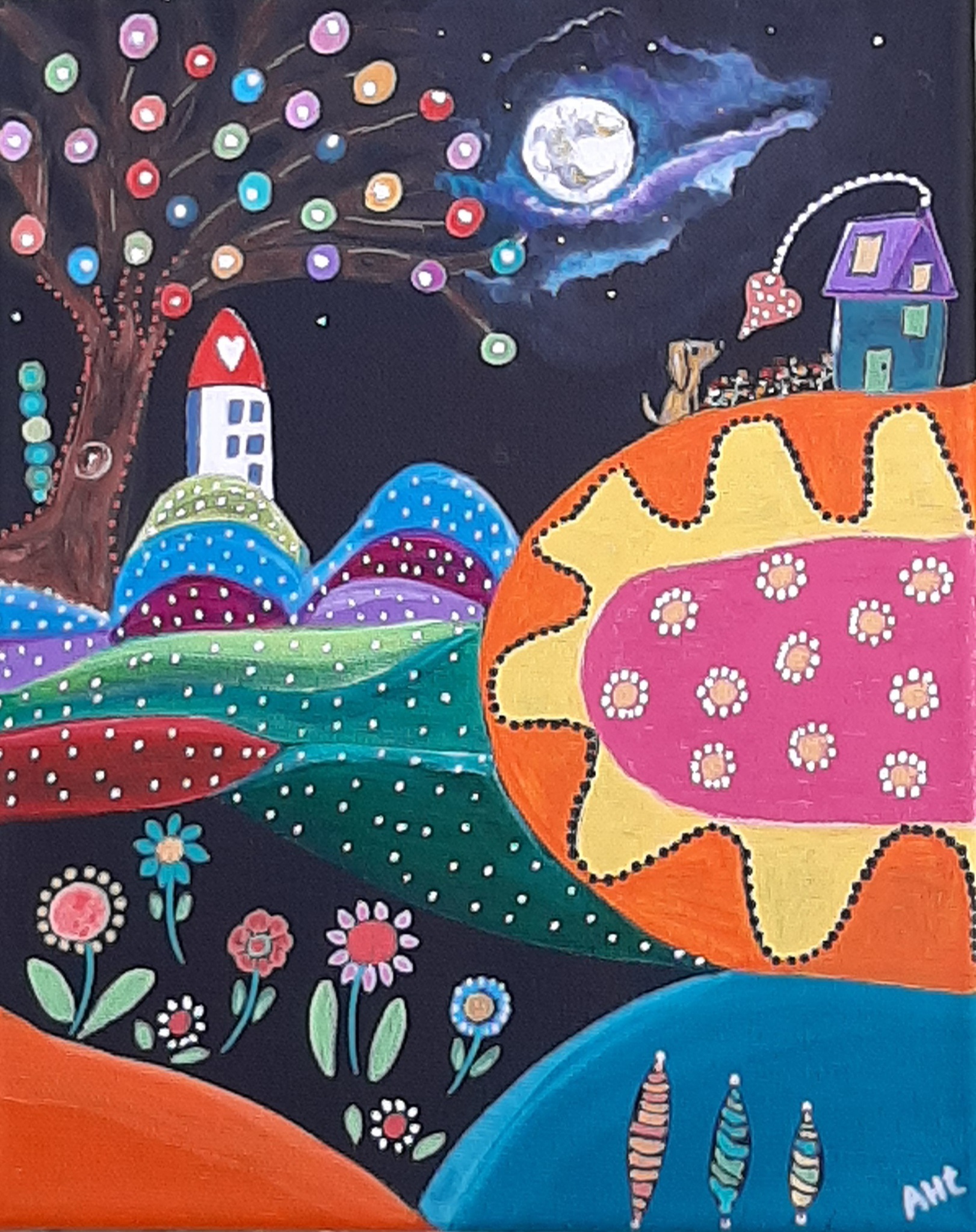 Schilderij Landschap Maan Kleurrijk Stippen Nacht Vrolijk Dog Hondje Teckeltje Dotpaint