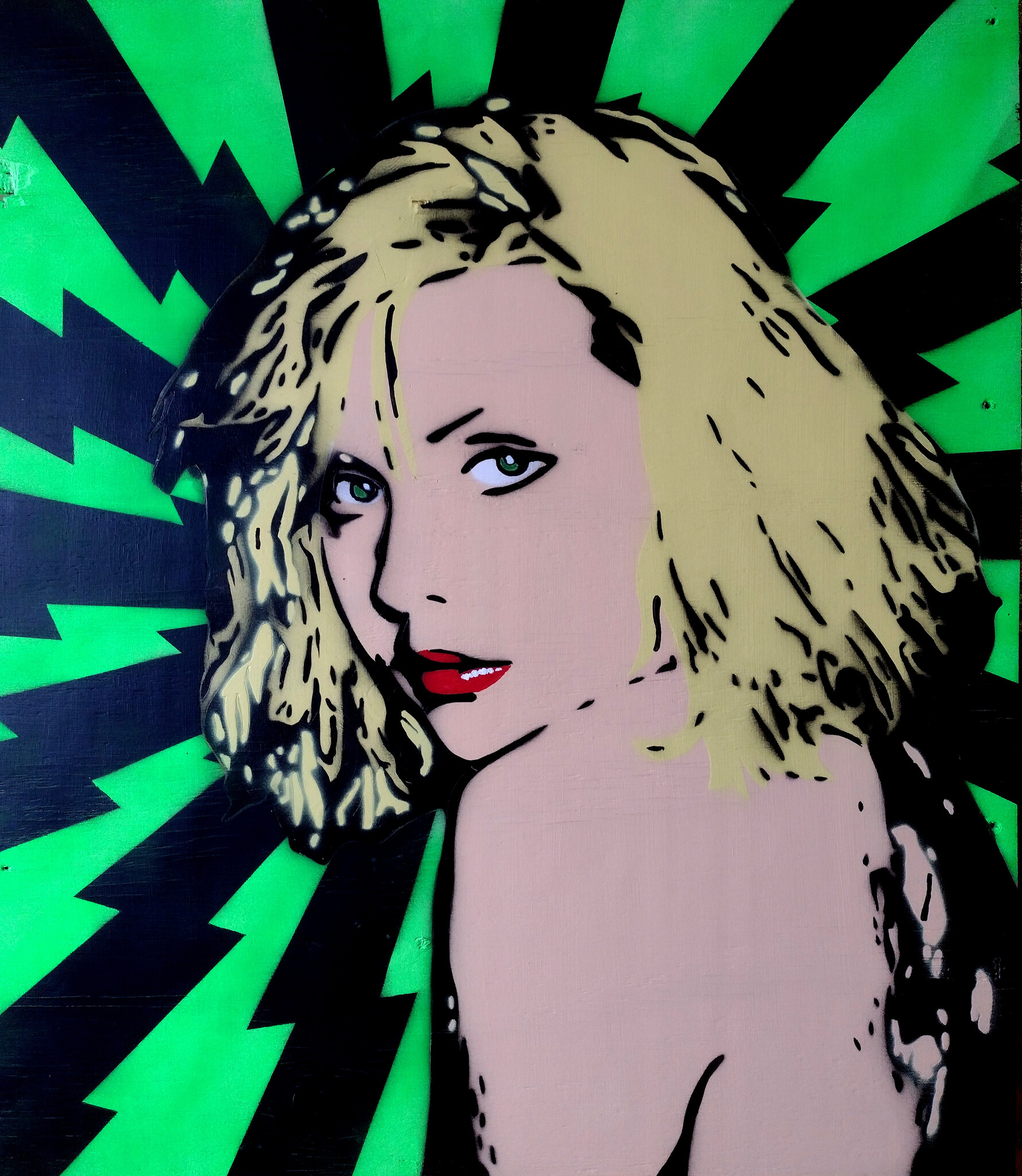 Spuitbus op hout, gemaakt met handgesneden sjablonen.