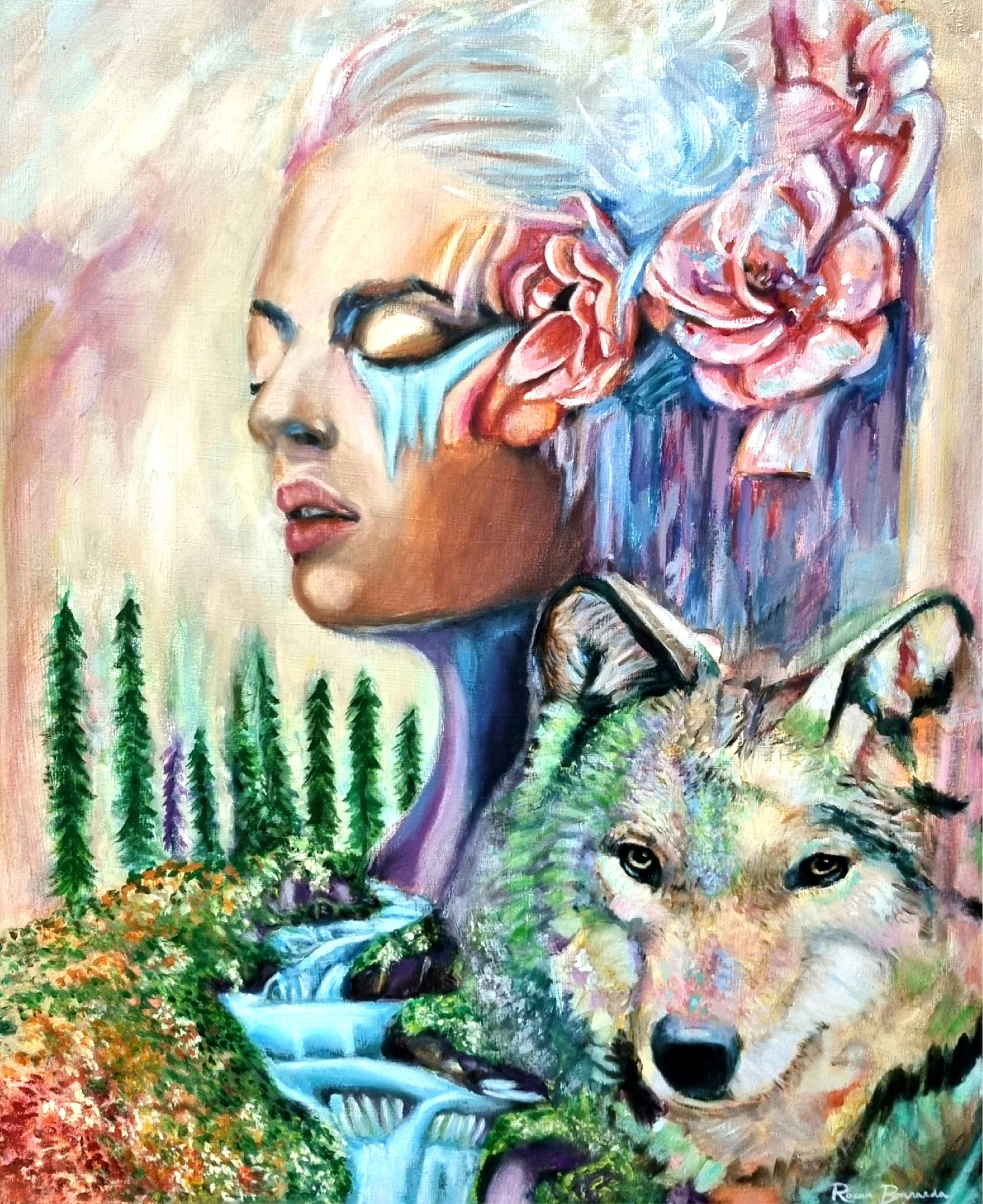 Ontdek 'Peaceful Path', een boeiend olieverfschilderij dat uitnodigt tot contemplatie over de reis van het leven. Ontdek de moed om met de stroom mee te gaan, gesymboliseerd door een sereen rivierlandschap, een vrouw met gesloten ogen en een krachtige wolf in een weelderig bos. Laat je onderdompelen in de schoonheid van het nemen van risico's en intuïtieve kracht door middel van dit meesterwerk op canvas van 50 x 63 cm.