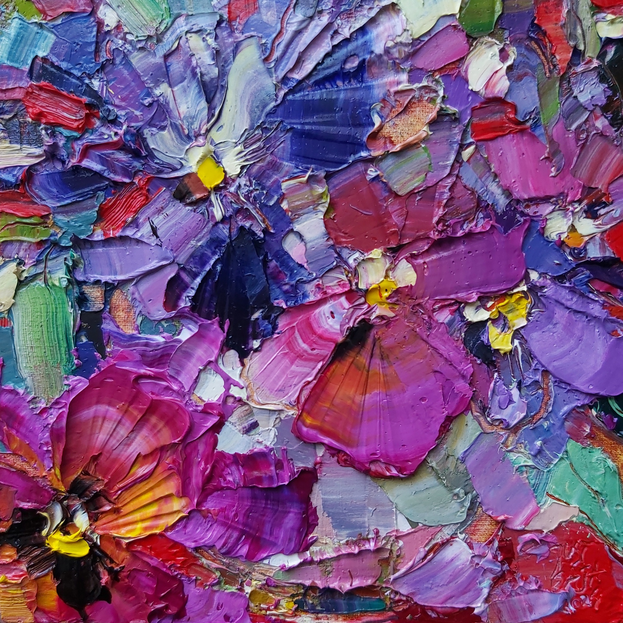 Schilderij Abstract Rood Paars Bloemen Art Kleurrijk Oil Canvas Kunst Bloem Violet Still Life Flowers Figurative Stillevens Artist Impression Kleine Miniatuur Happy Woonkamer Levendig Viooltjes