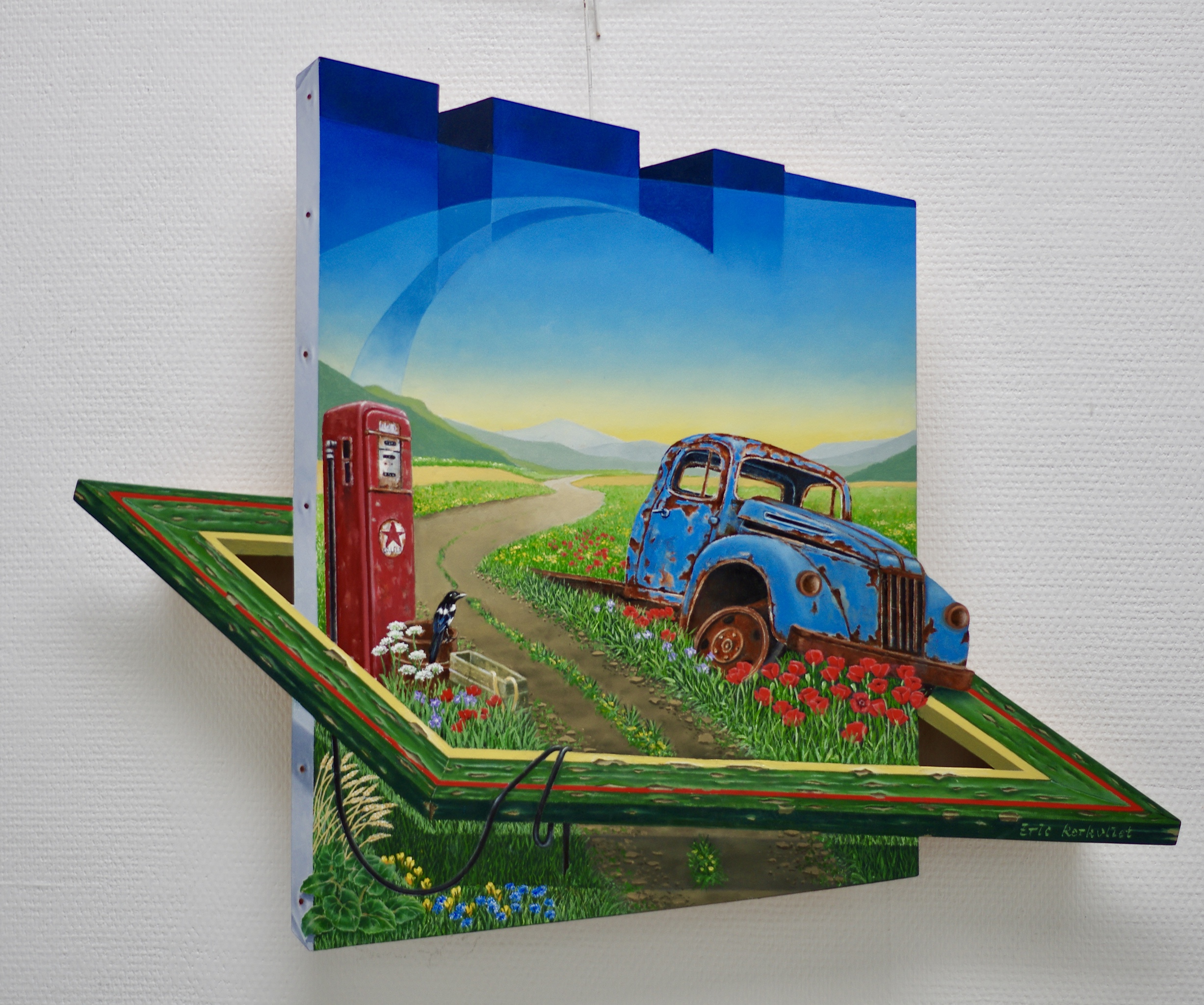 Eric Kerkvliet schildert met olieverf uiterst gedetailleerd voorstellingen op iets verhoogd paneel waardoor bij juiste belichting een Trompe-l’oeil-achtig effect ontstaat.