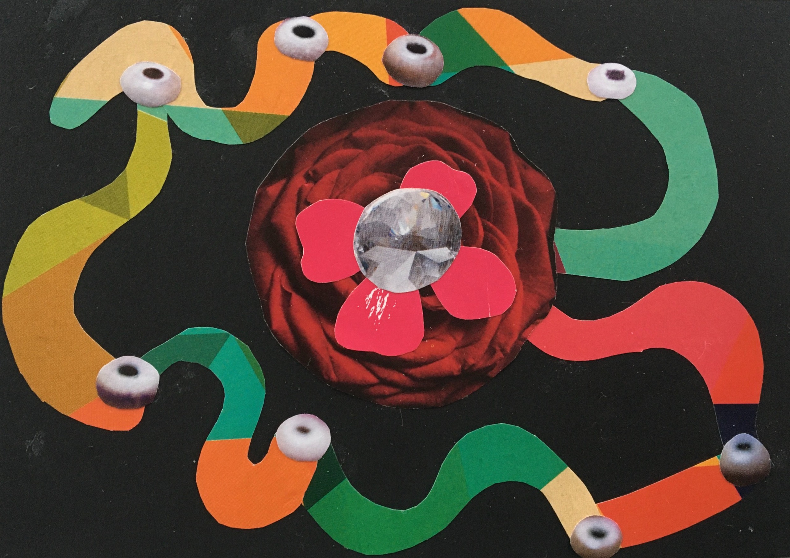 Ik maak papieren collages. Hiervoor gebruik ik tijdschriften, bij voorkeur de meer glossy uitgaven. Ik volg mijn intuïtie en gebruik mijn verstand bij het oplossen van 'problemen' in de verbinding van de papieren onderdelen.
