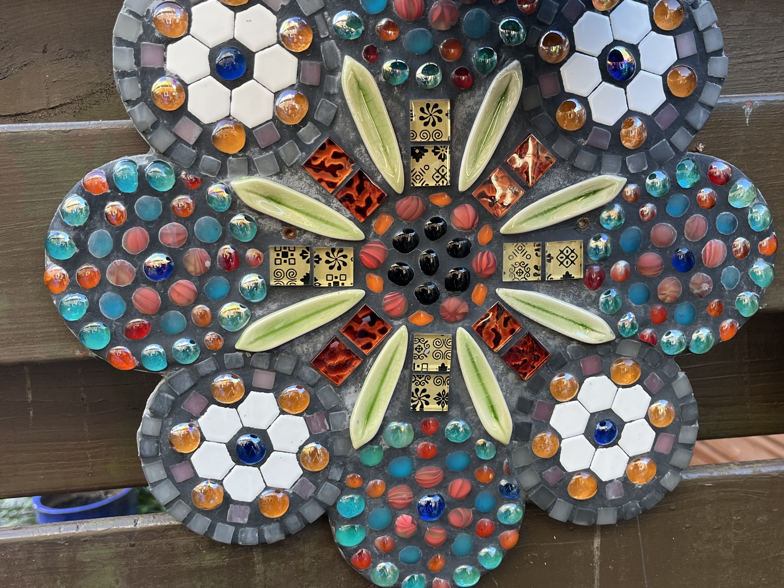 Kleurrijke en warme mozaïek gemaakt met liefde. Wij maken samen grote projecten en óók onze eigen stukken. Het verwerken van verschillende materialen is een belangrijke kenmerk van ons werk.