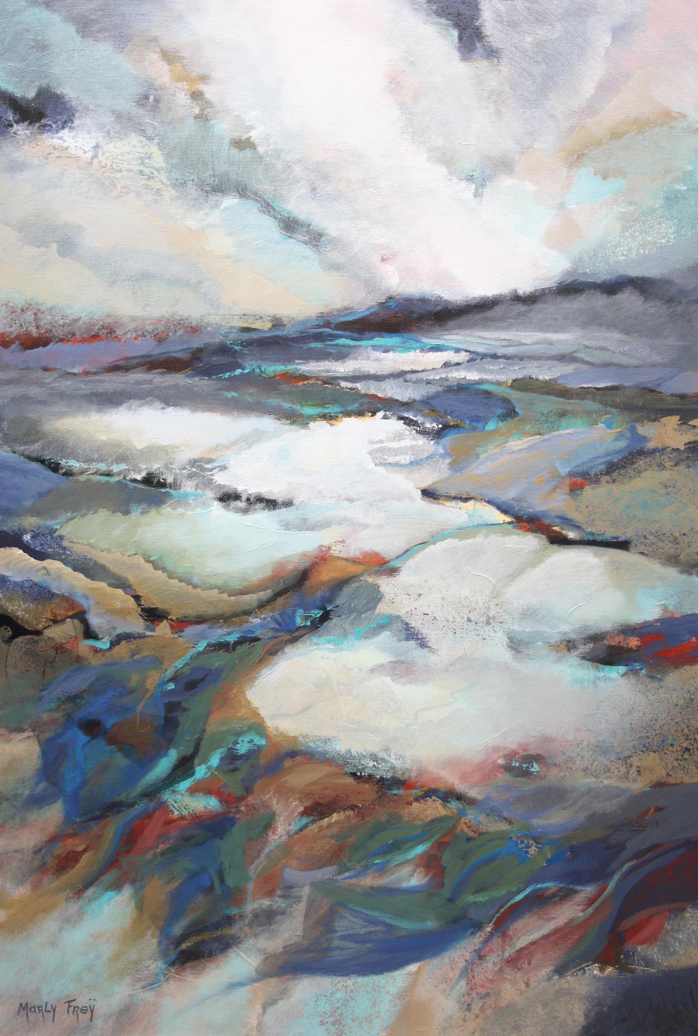 Marly Freij maakt grote kleurrijke, maar ook meer ingetogen schilderijen in gemengde techniek, met name sferische landschappen en abstracte composities