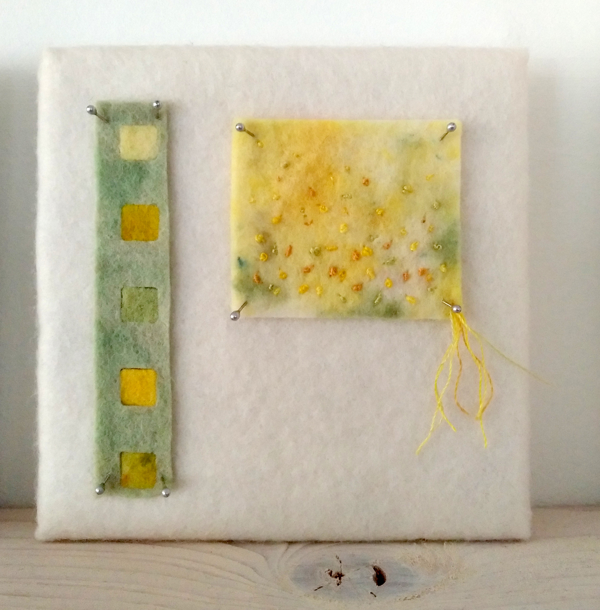 een combinatie van gekleurd kant en klaarvilt met handgeverfd en eco handgeverfd vilt, borduurzijde, spelden, schildersdoek.