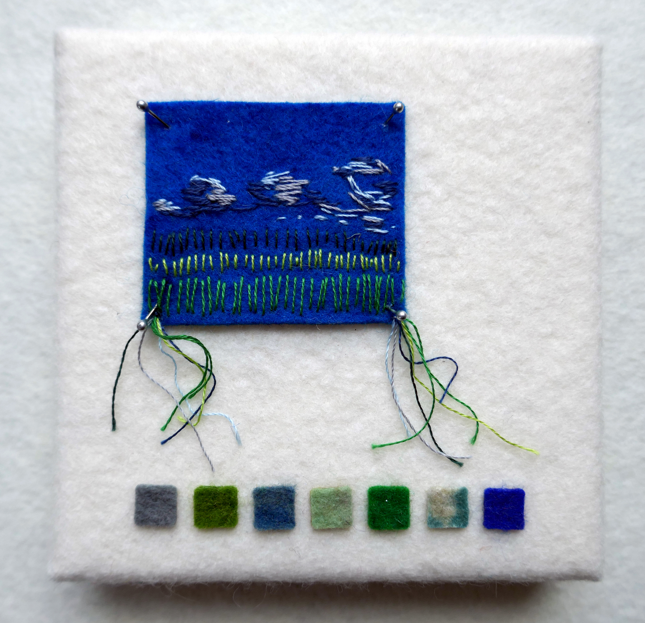 een combinatie van gekleurd kant en klaarvilt met handgeverfd en eco handgeverfd vilt, borduurzijde, spelden, schildersdoek.