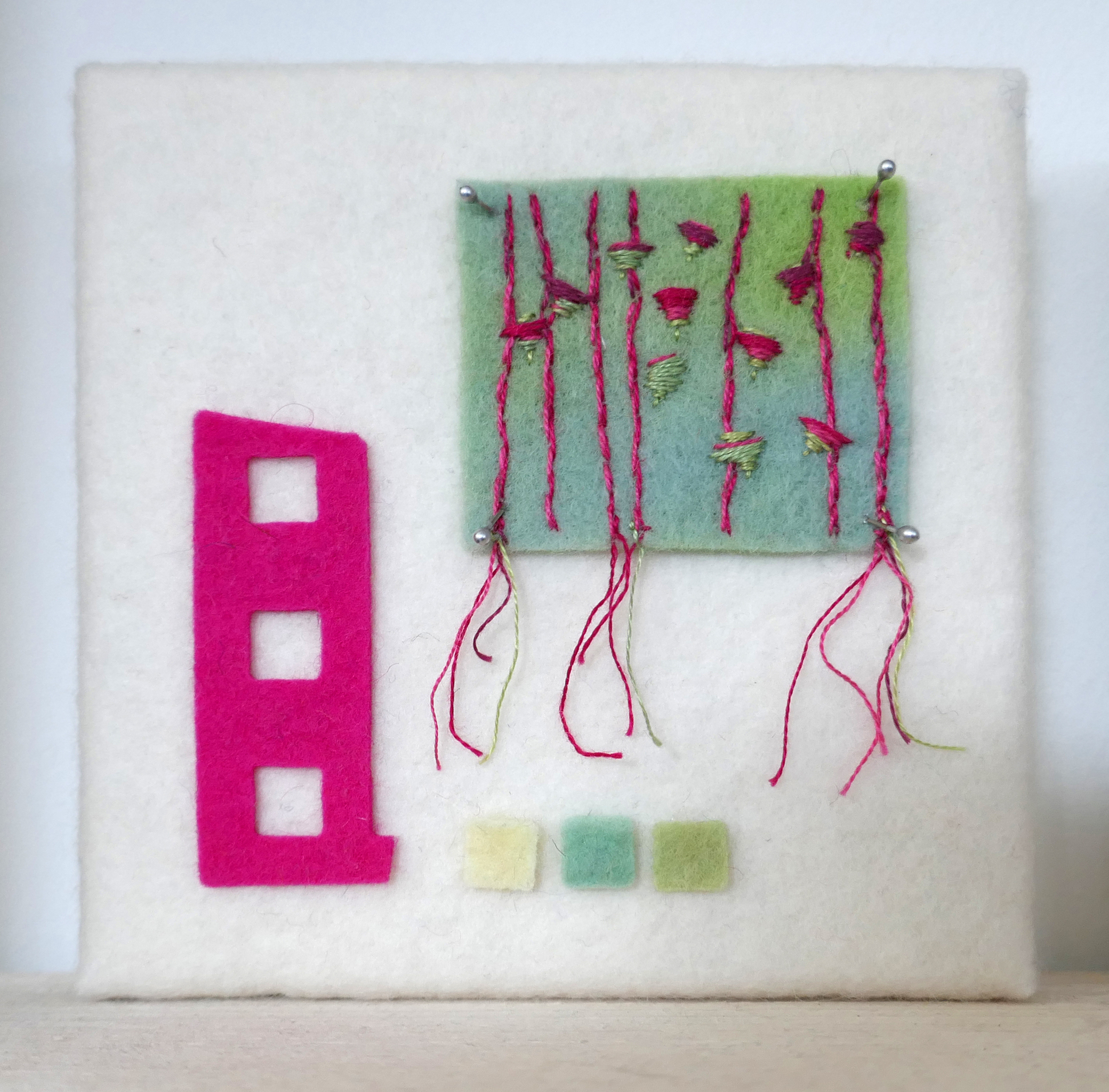 een combinatie van gekleurd kant en klaarvilt met handgeverfd en eco handgeverfd vilt, borduurzijde, spelden, schildersdoek.