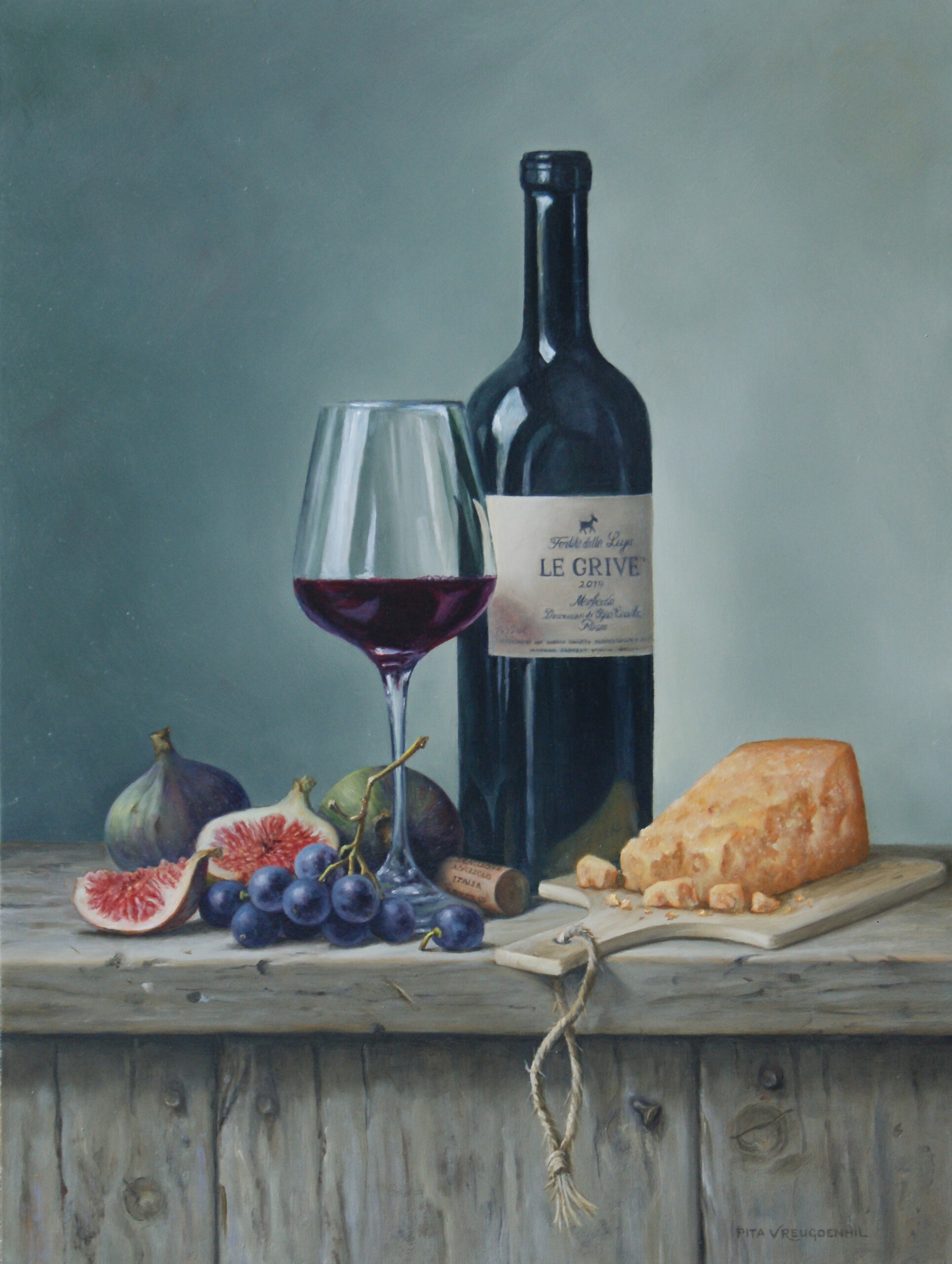 Le Grive, opdracht was een schilderij met een fles wijn, Le grive, en de sfeer vsn Italië Verkocht